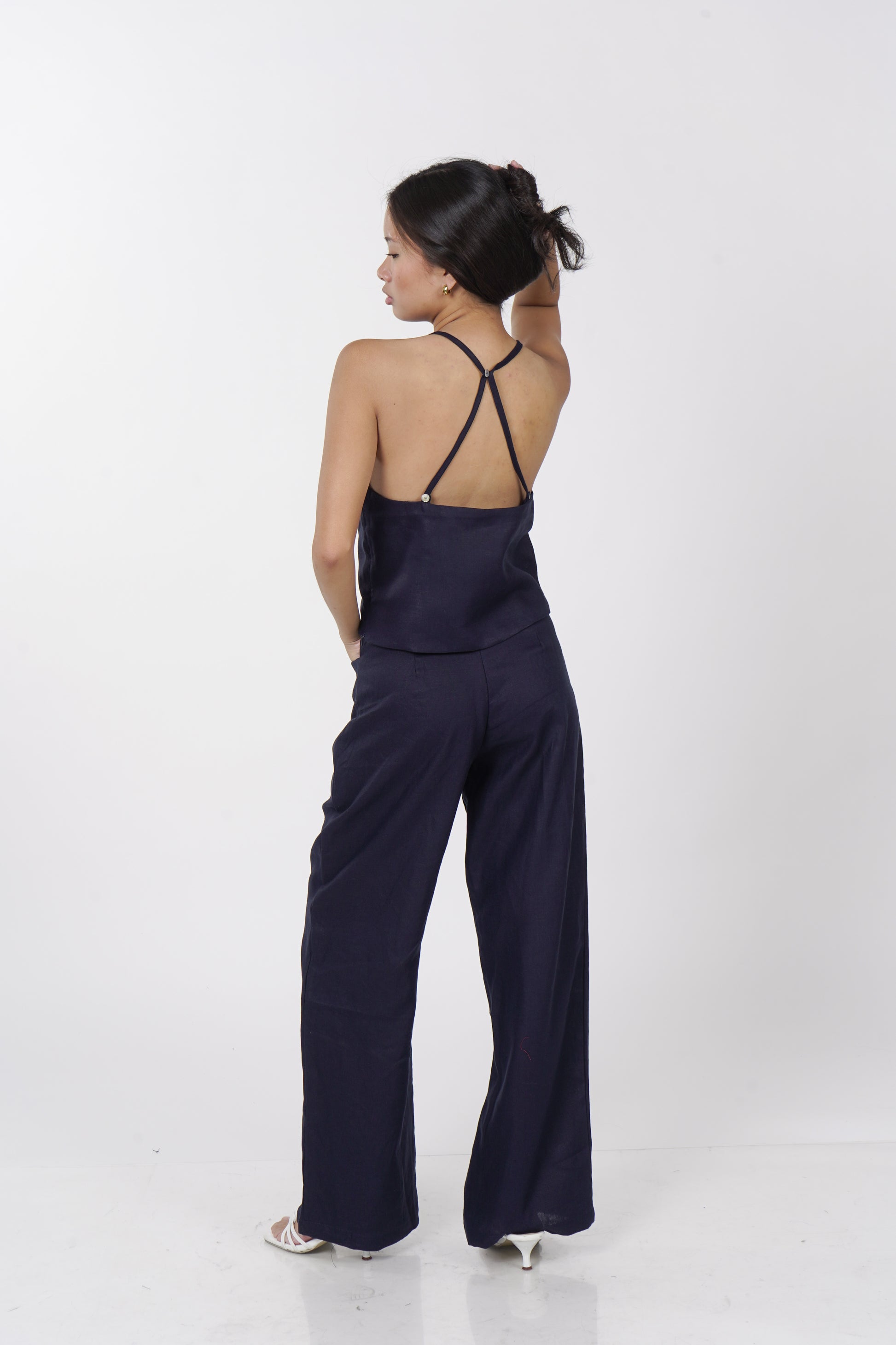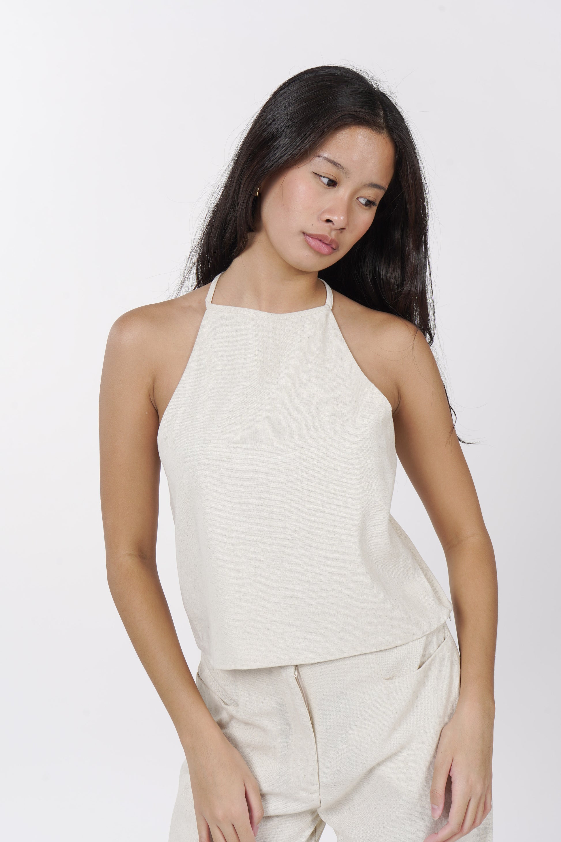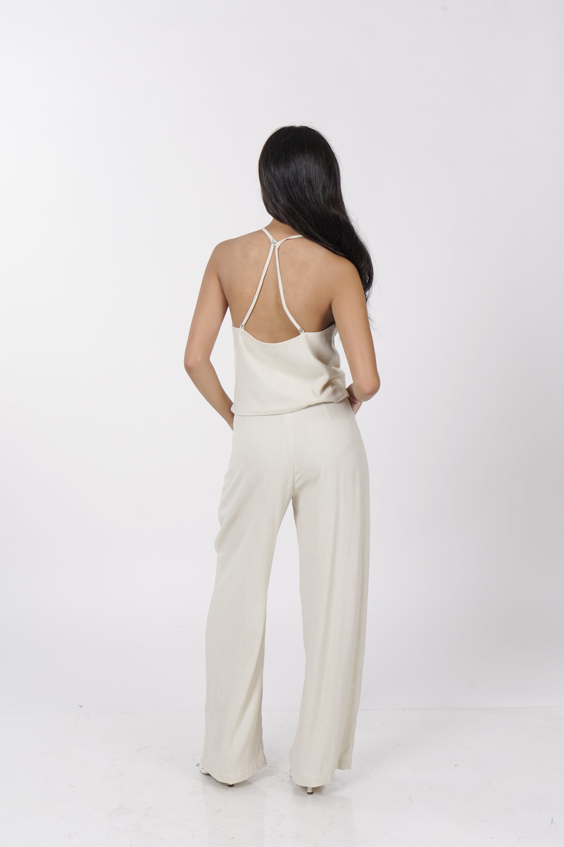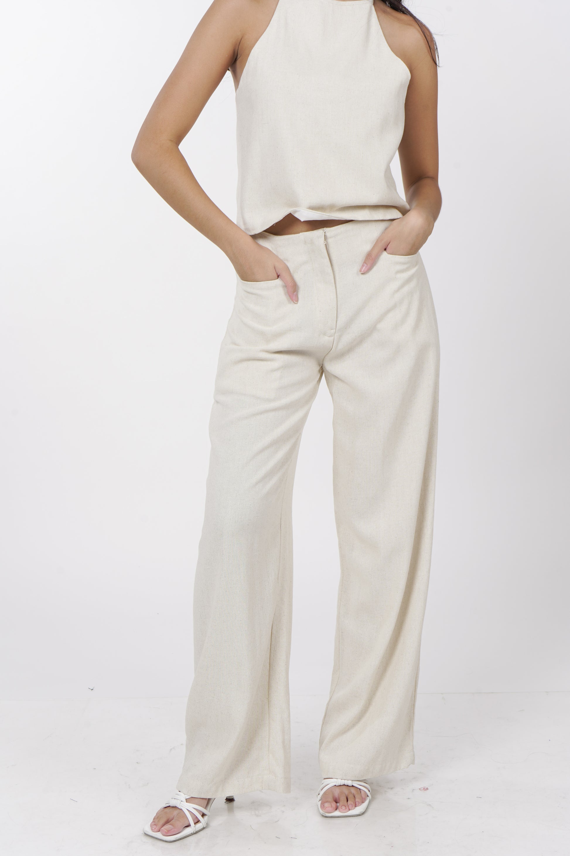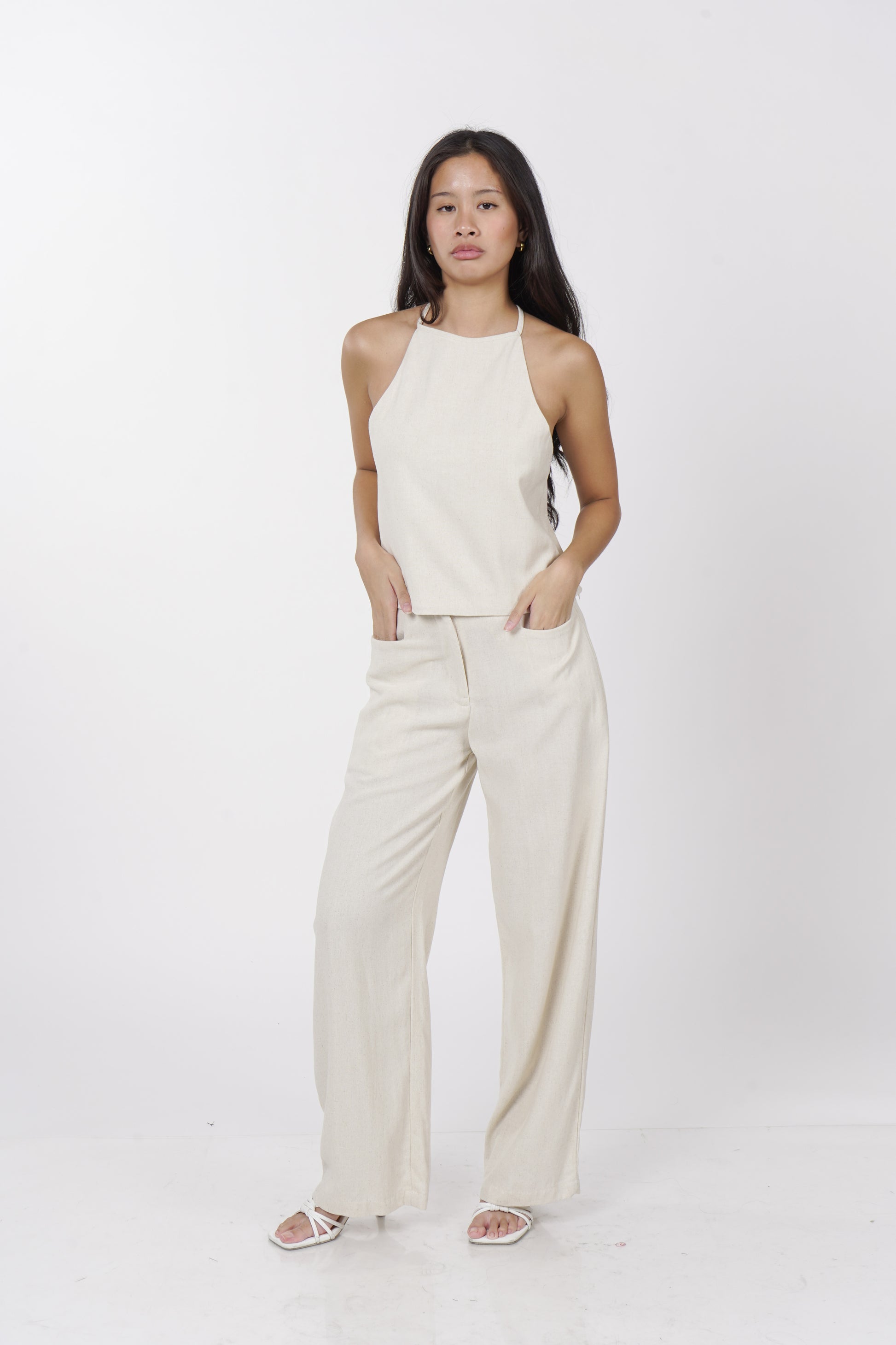 A daily staple set. The Maita top is fully lined with a halter neckline. Comes with a back button detail and button adjusters for a snug fit. The Maita Pants features a slit front pockets and hook closure. Best paired with the Maita Top. Model wear Extra Small. Made in Linen.