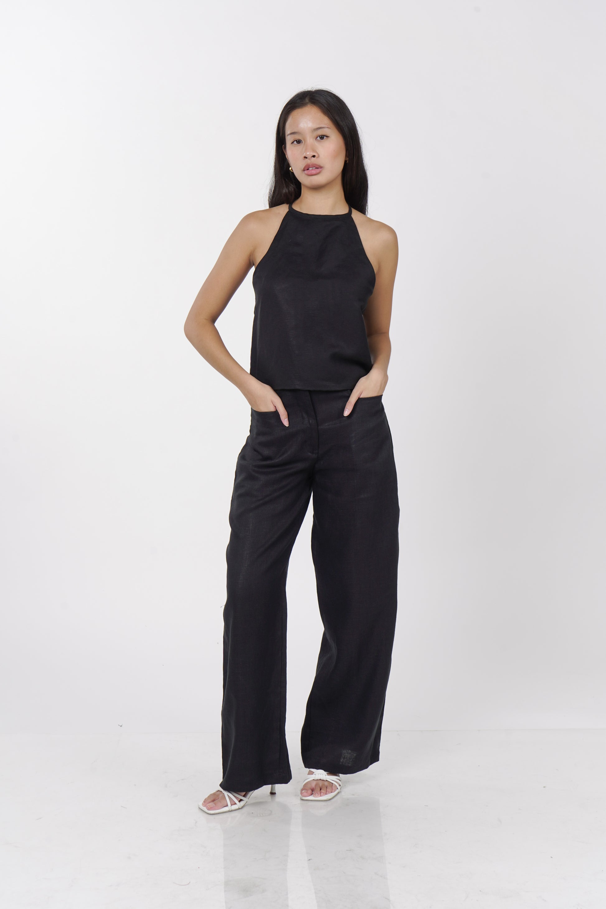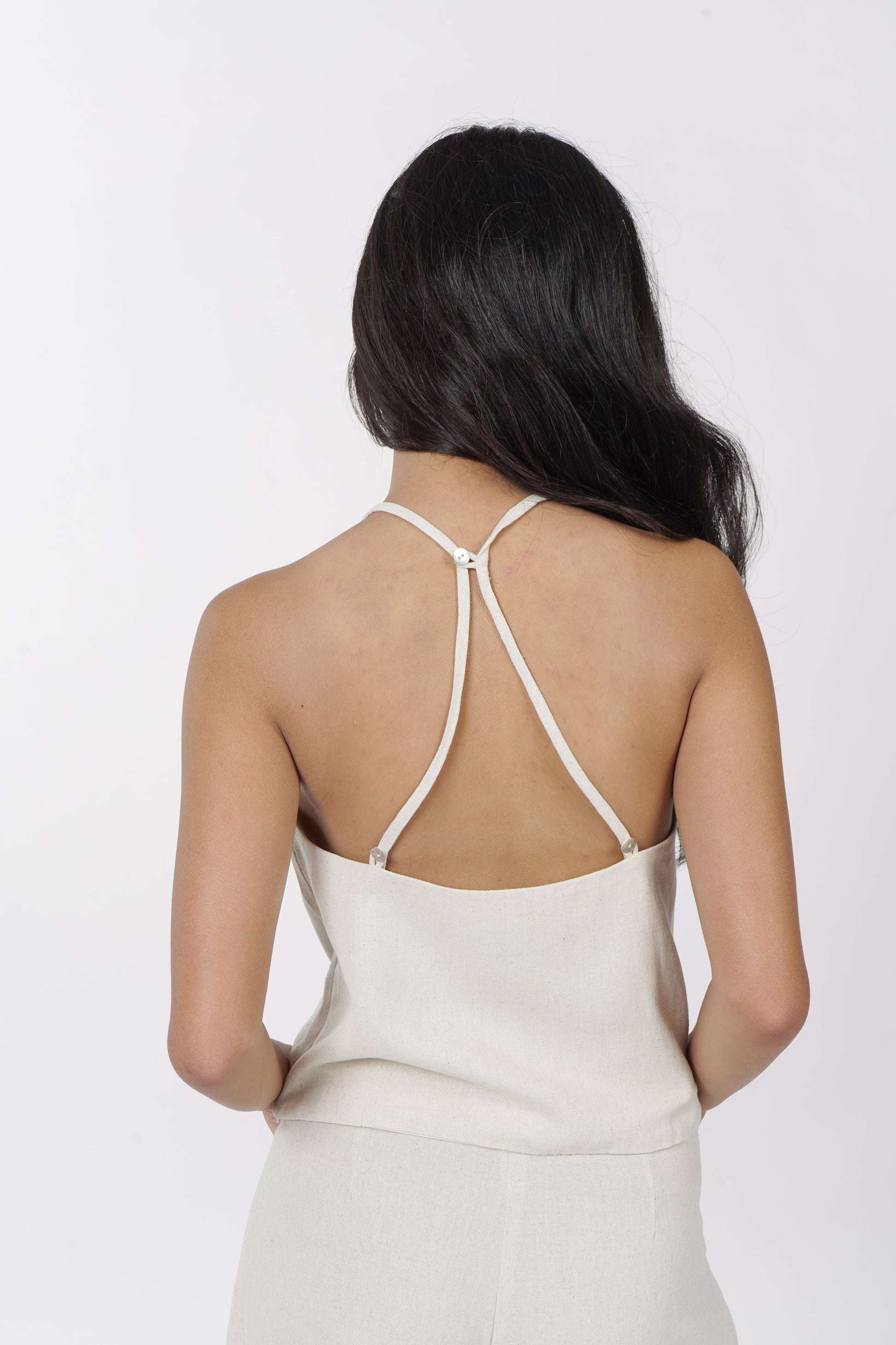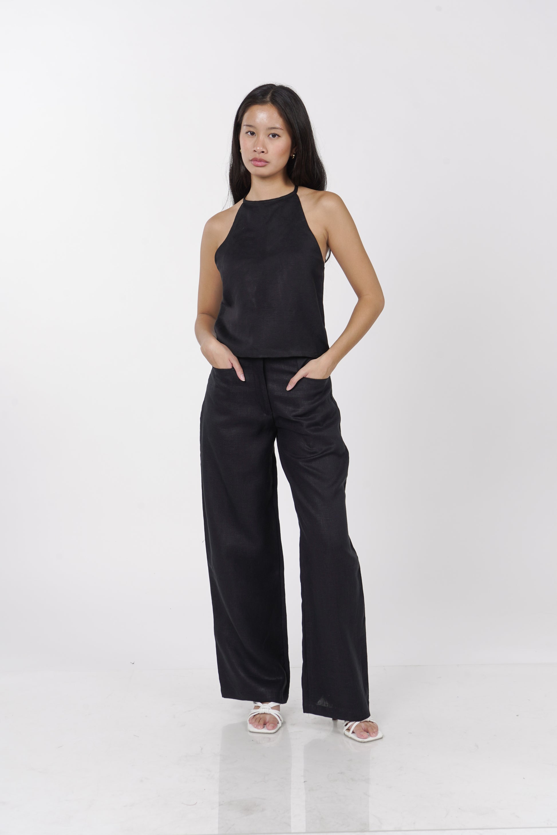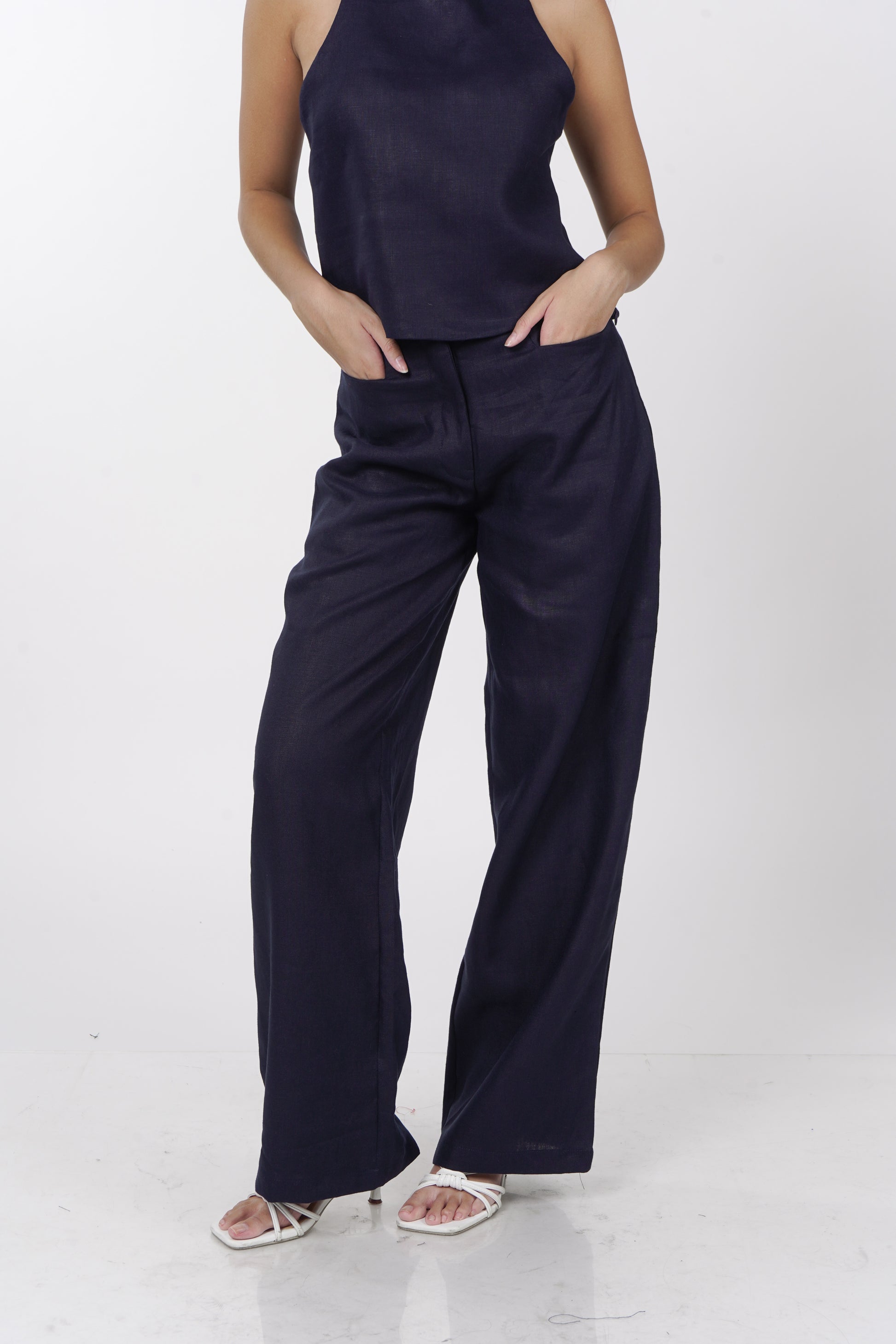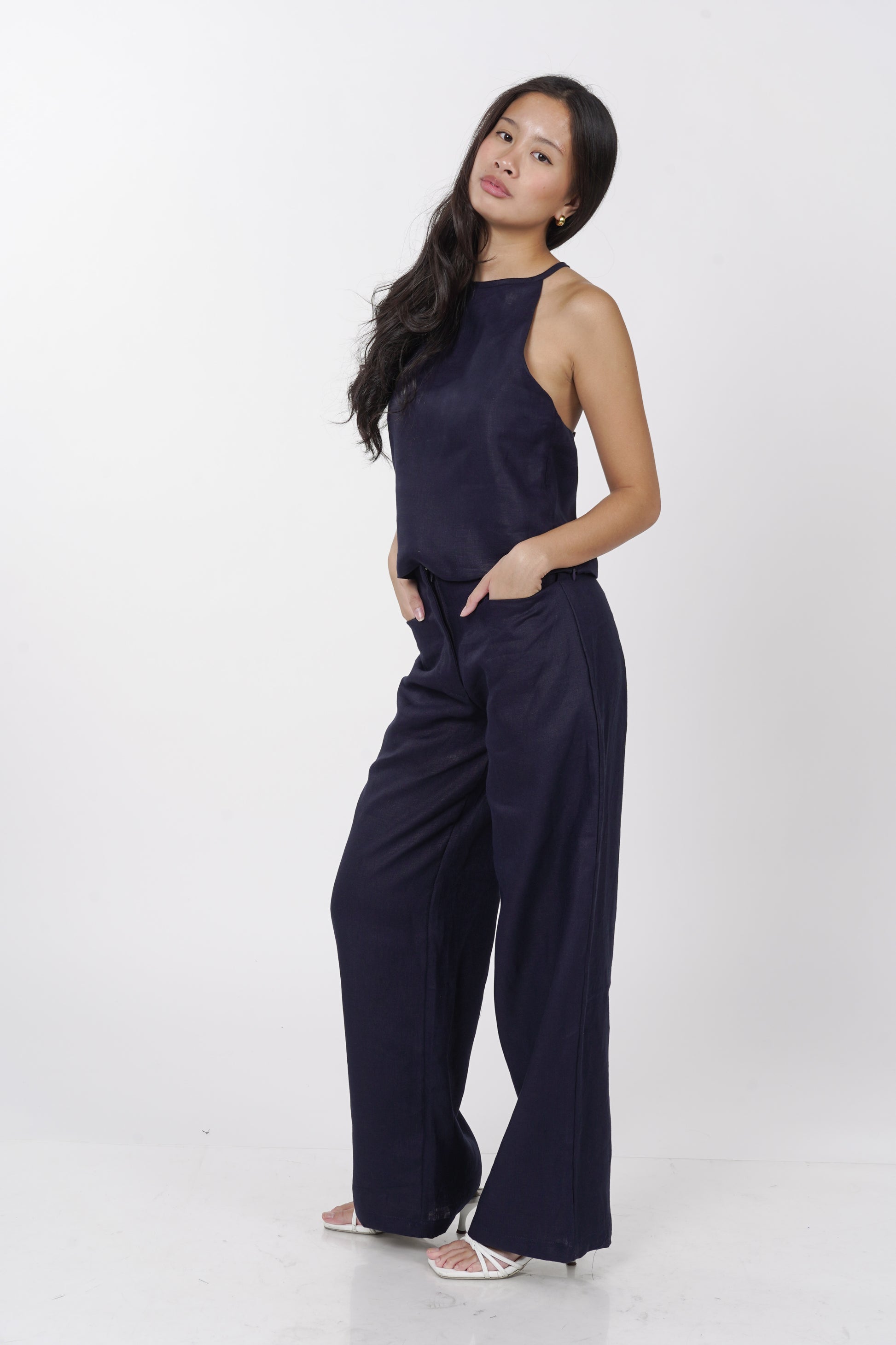 A daily staple set. The Maita top is fully lined with a halter neckline. Comes with a back button detail and button adjusters for a snug fit. The Maita Pants features a slit front pockets and hook closure. Best paired with the Maita Top. Model wear Extra Small. Made in Linen.