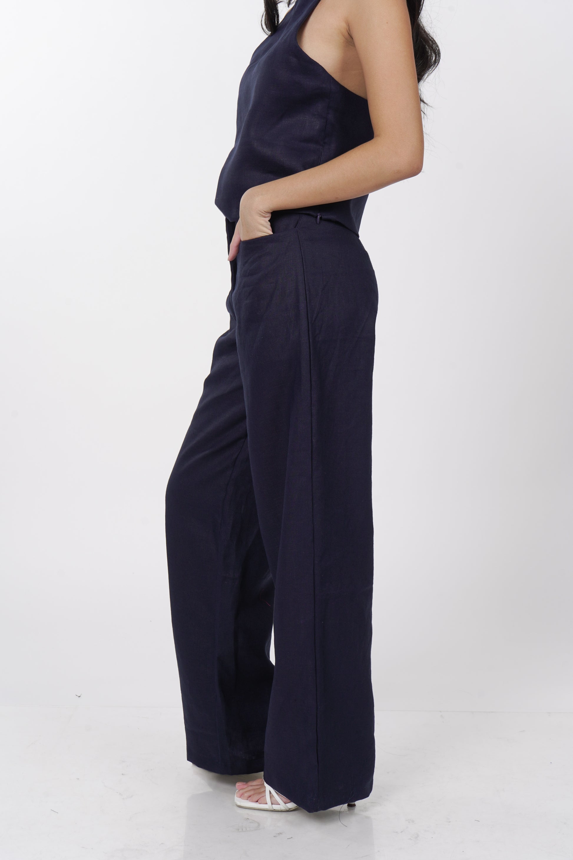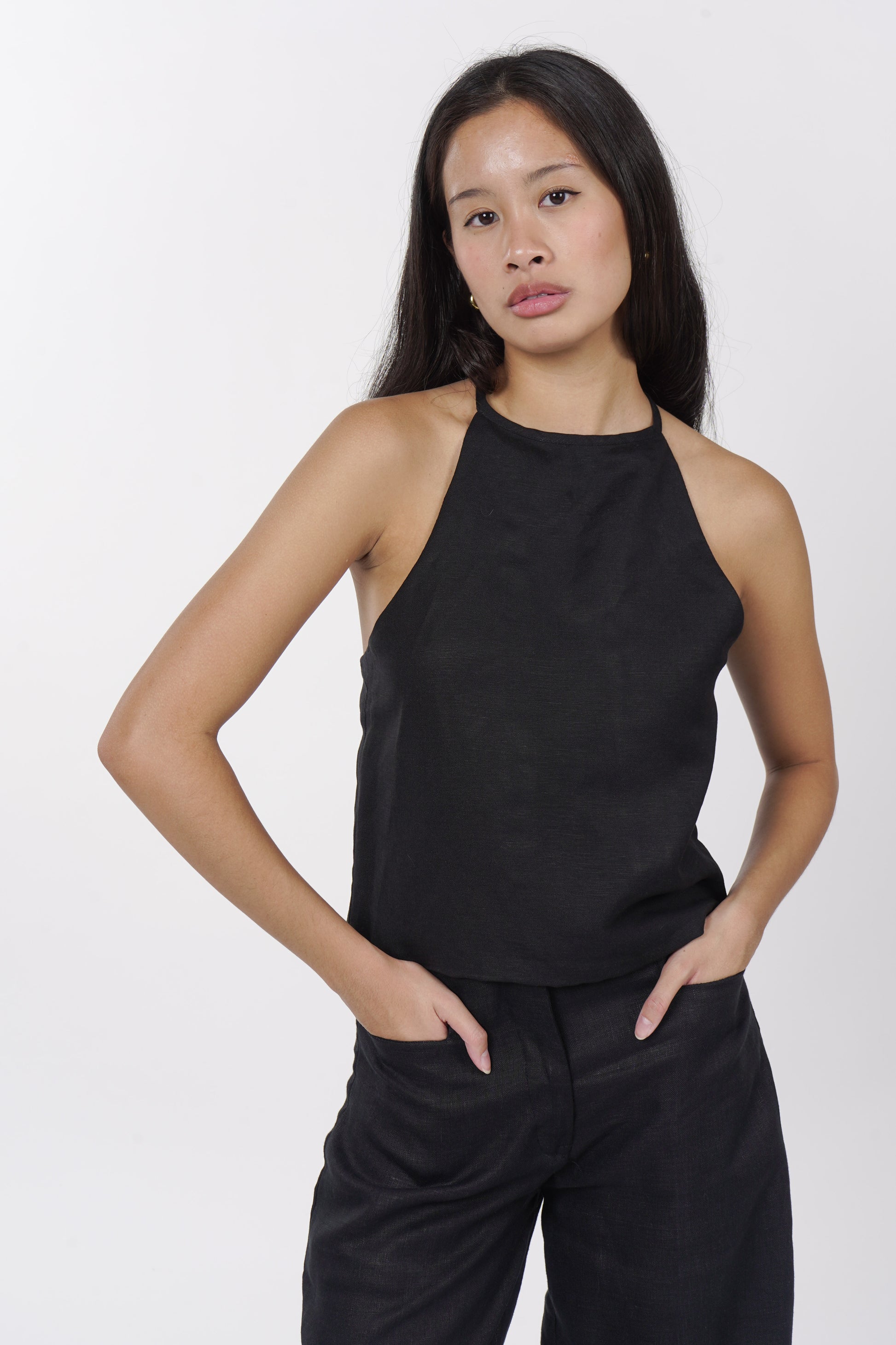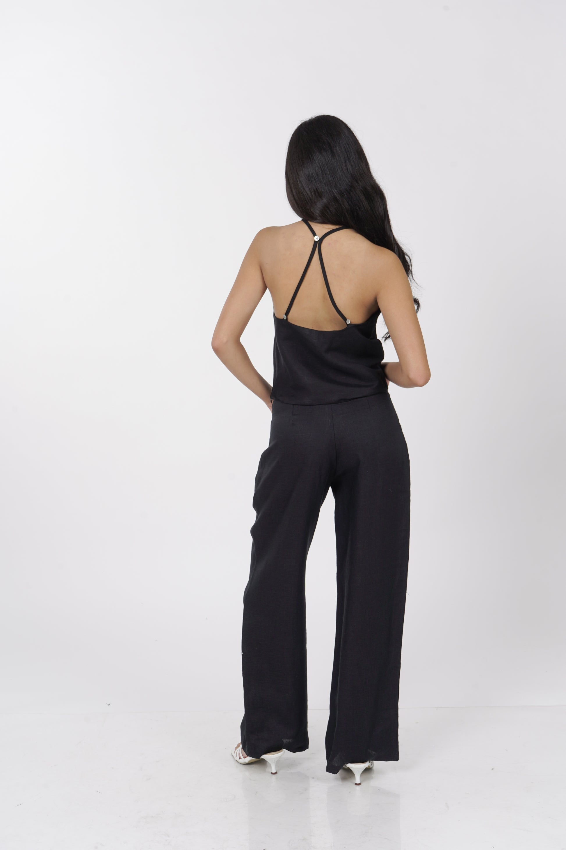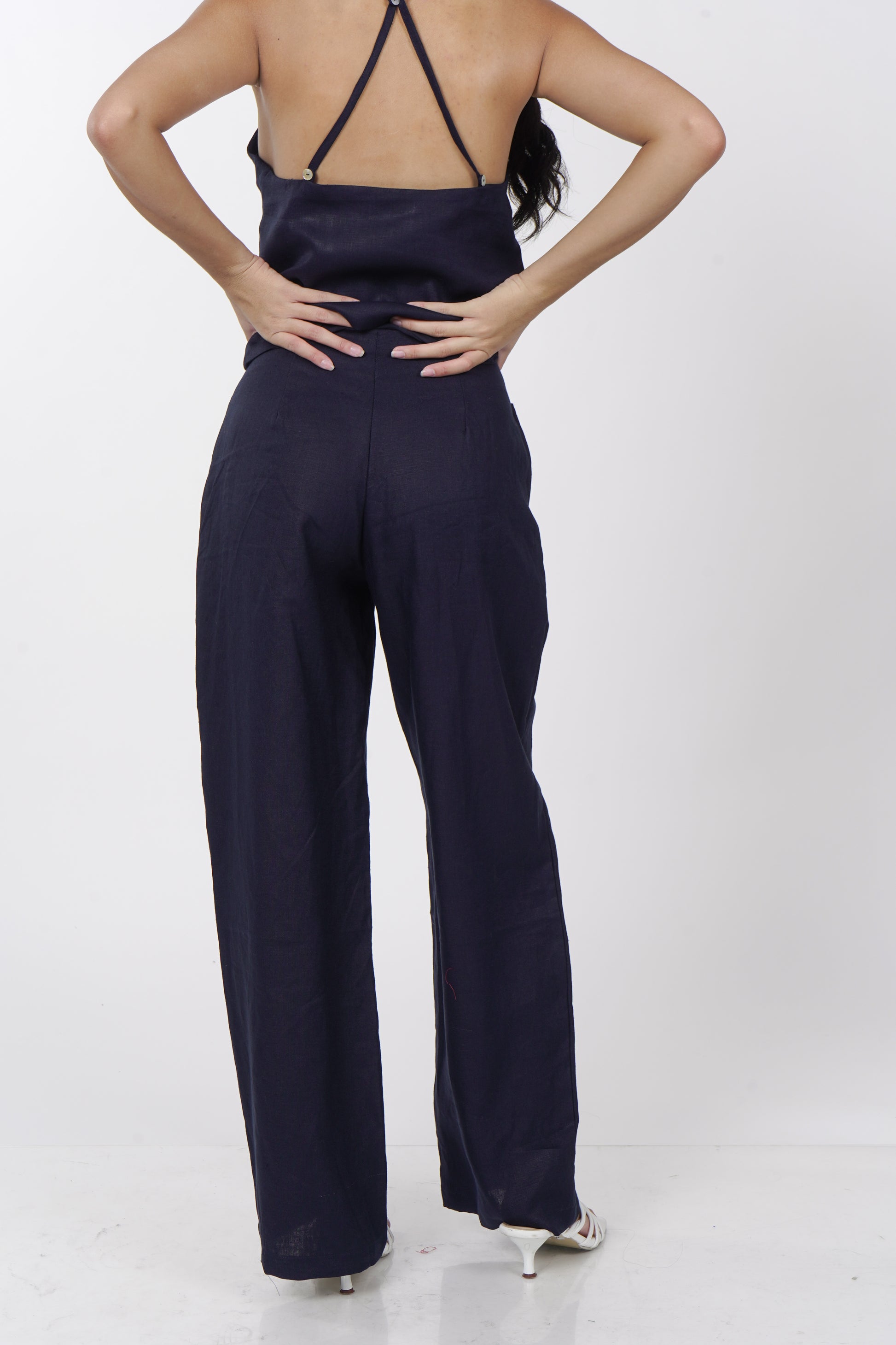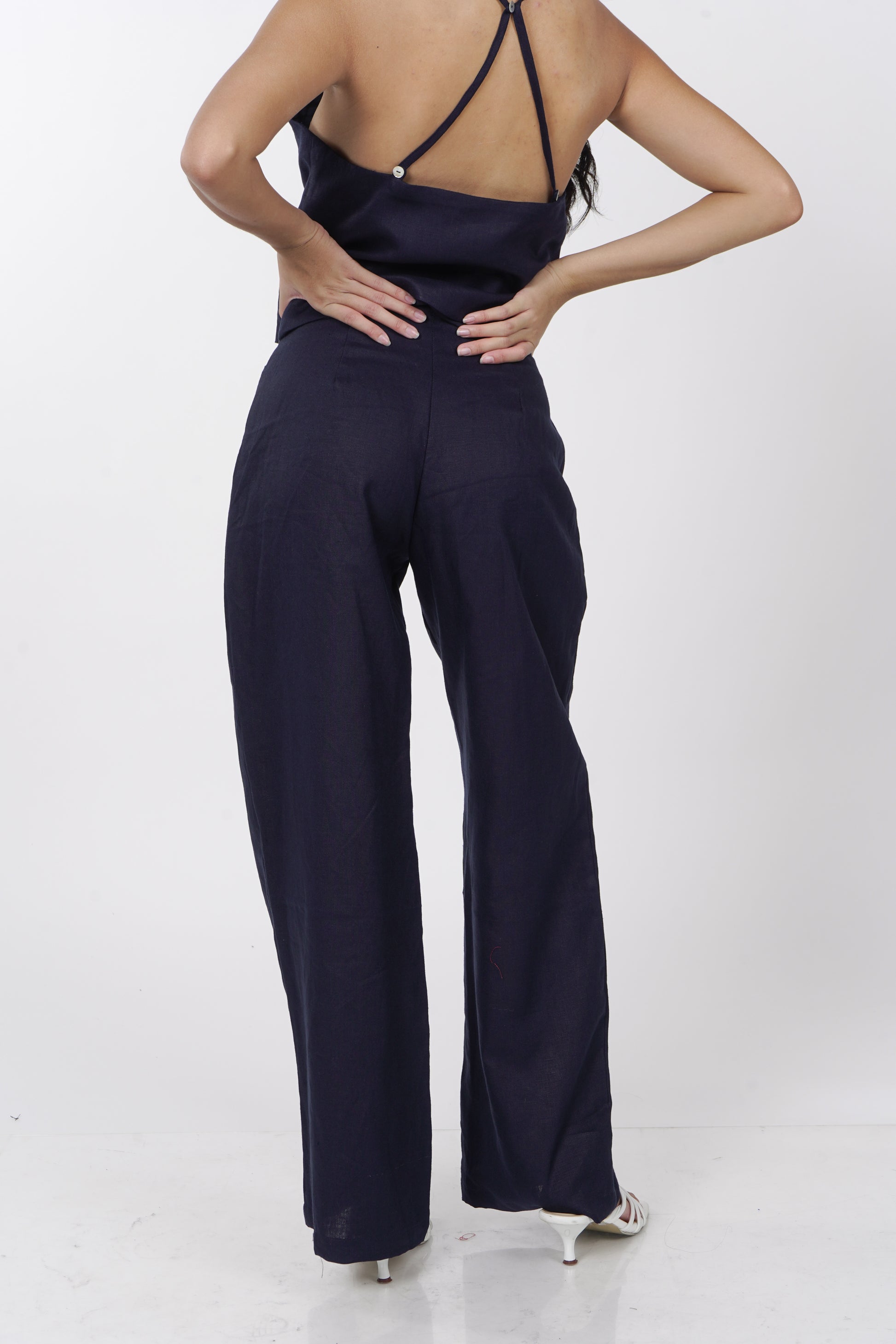 A daily staple set. The Maita top is fully lined with a halter neckline. Comes with a back button detail and button adjusters for a snug fit. The Maita Pants features a slit front pockets and hook closure. Best paired with the Maita Top. Model wear Extra Small. Made in Linen.