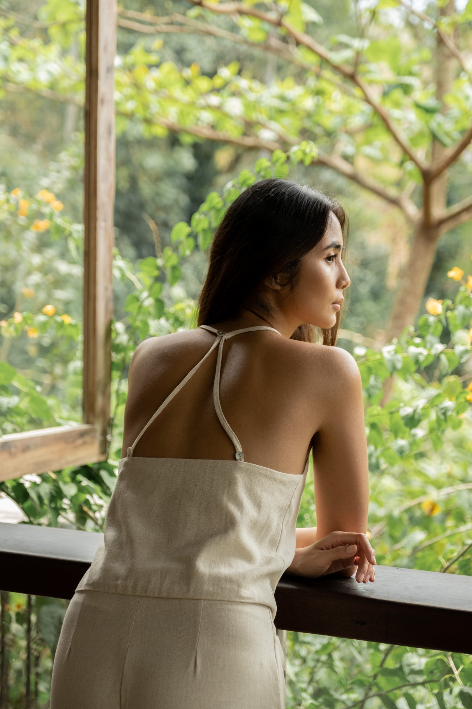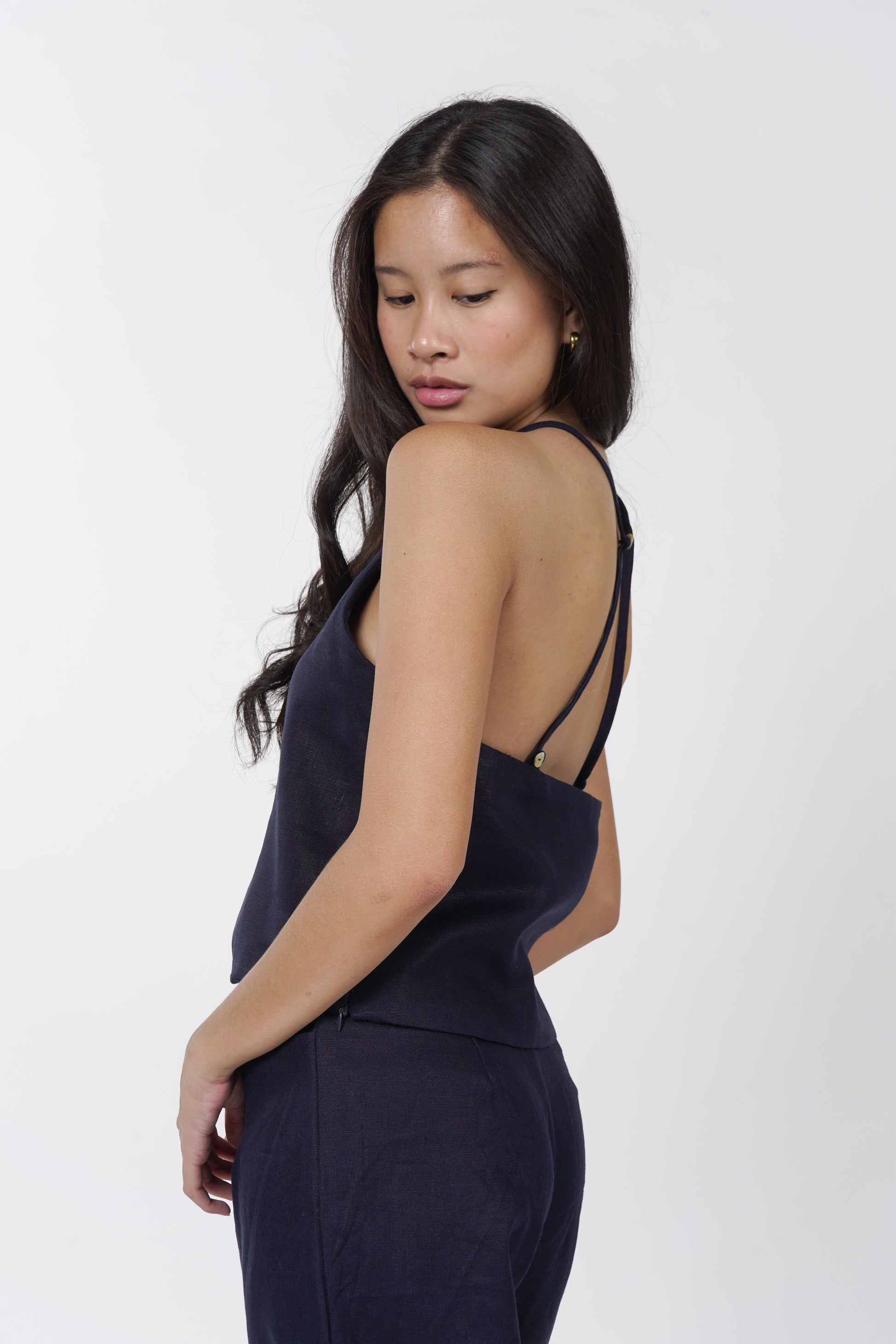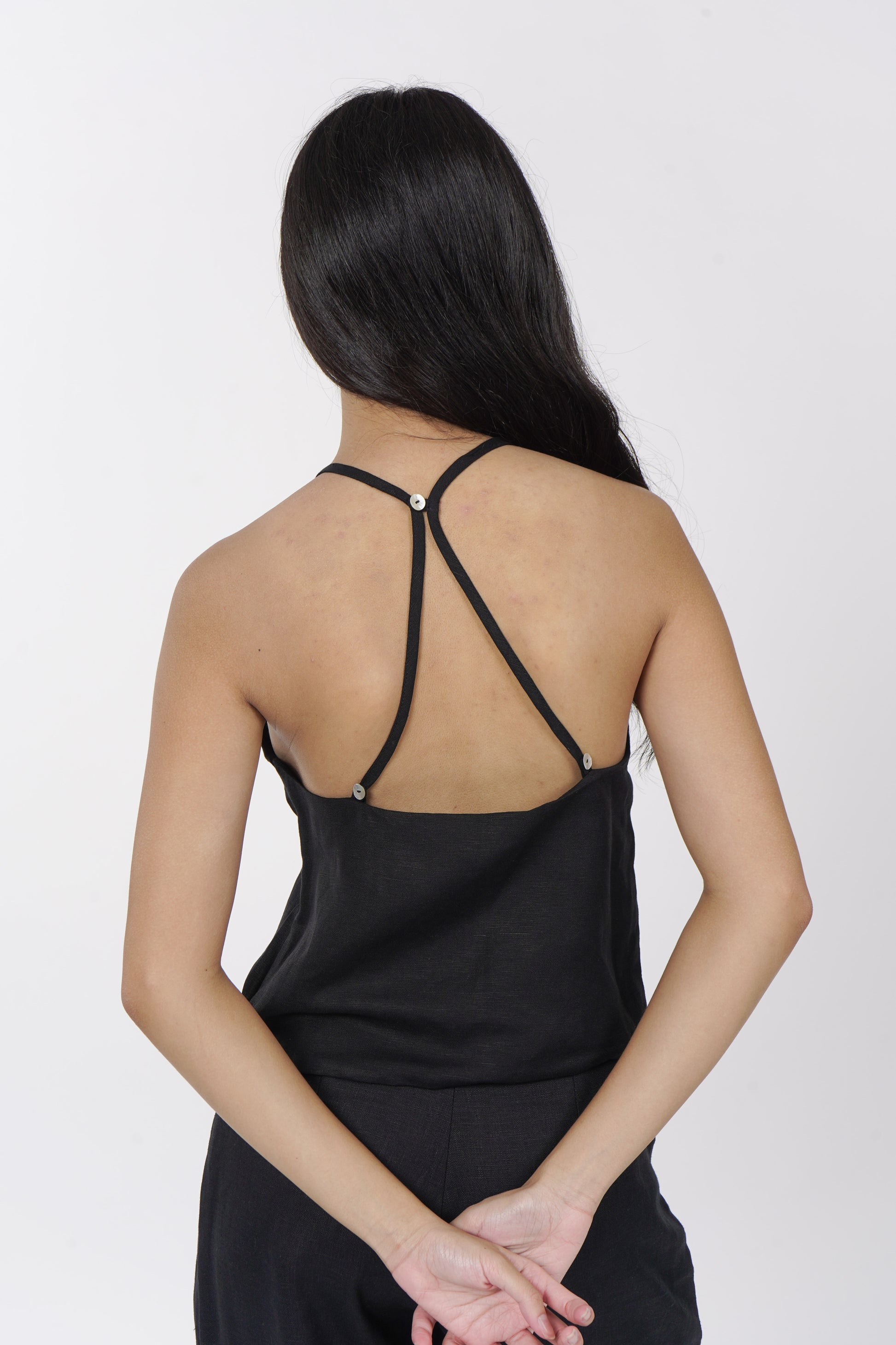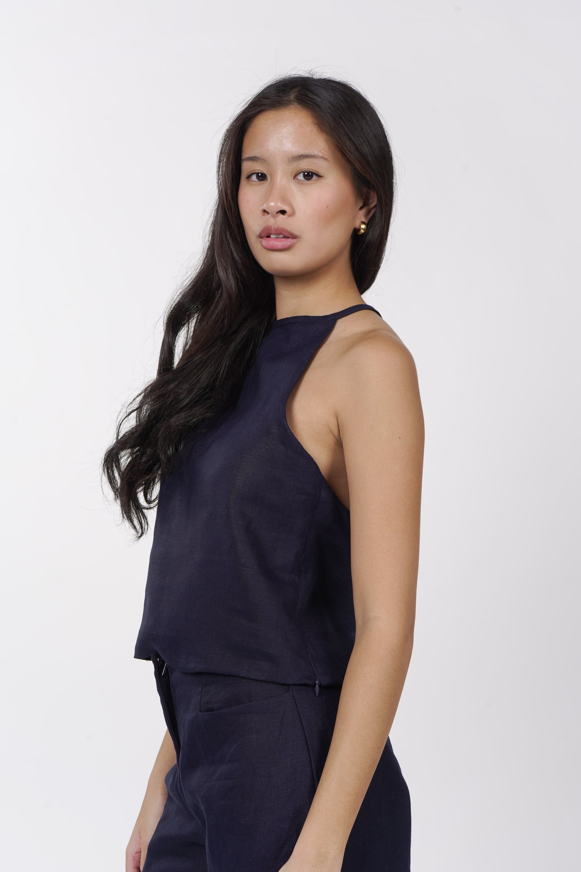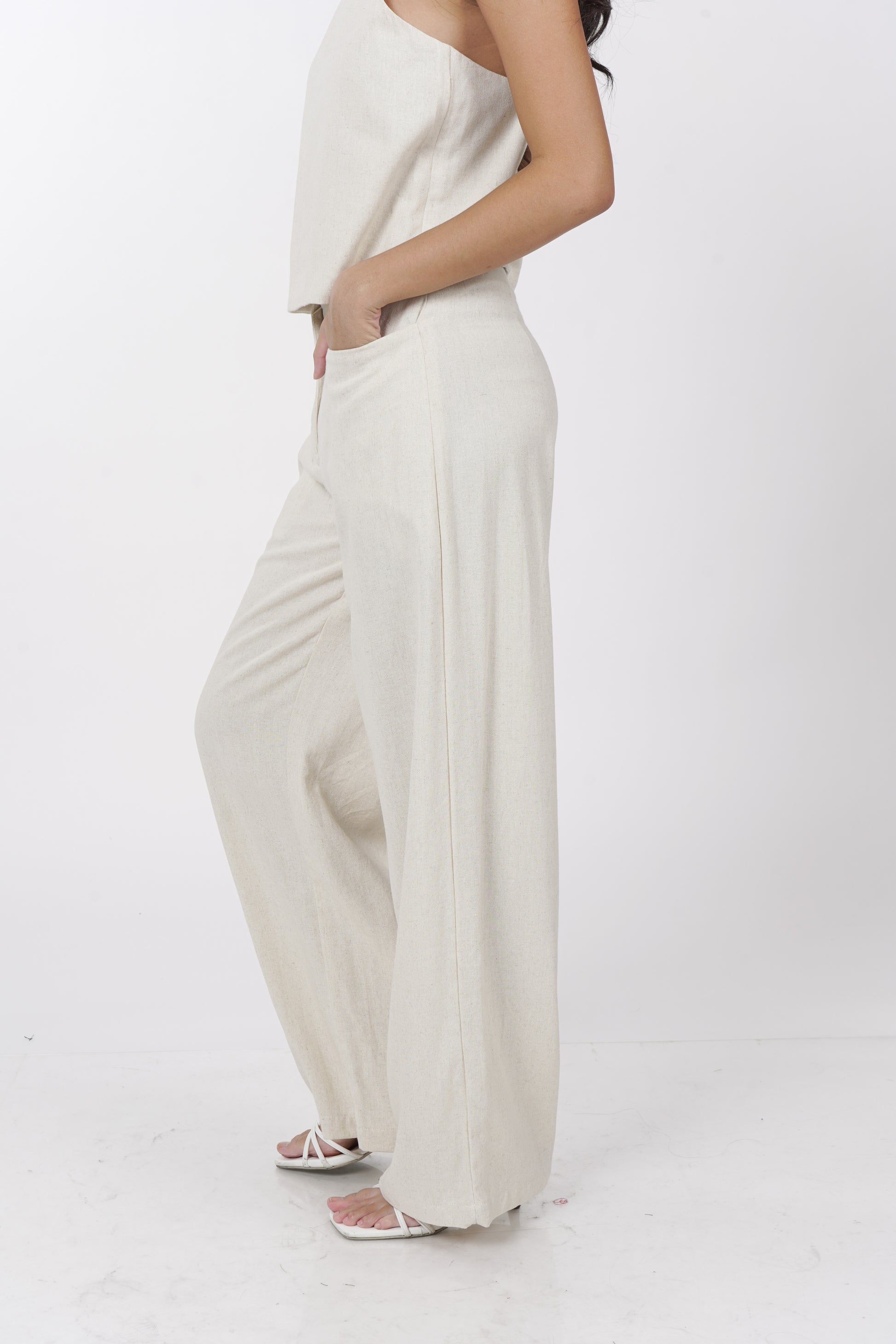 A daily staple set. The Maita top is fully lined with a halter neckline. Comes with a back button detail and button adjusters for a snug fit. The Maita Pants features a slit front pockets and hook closure. Best paired with the Maita Top. Model wear Extra Small. Made in Linen.