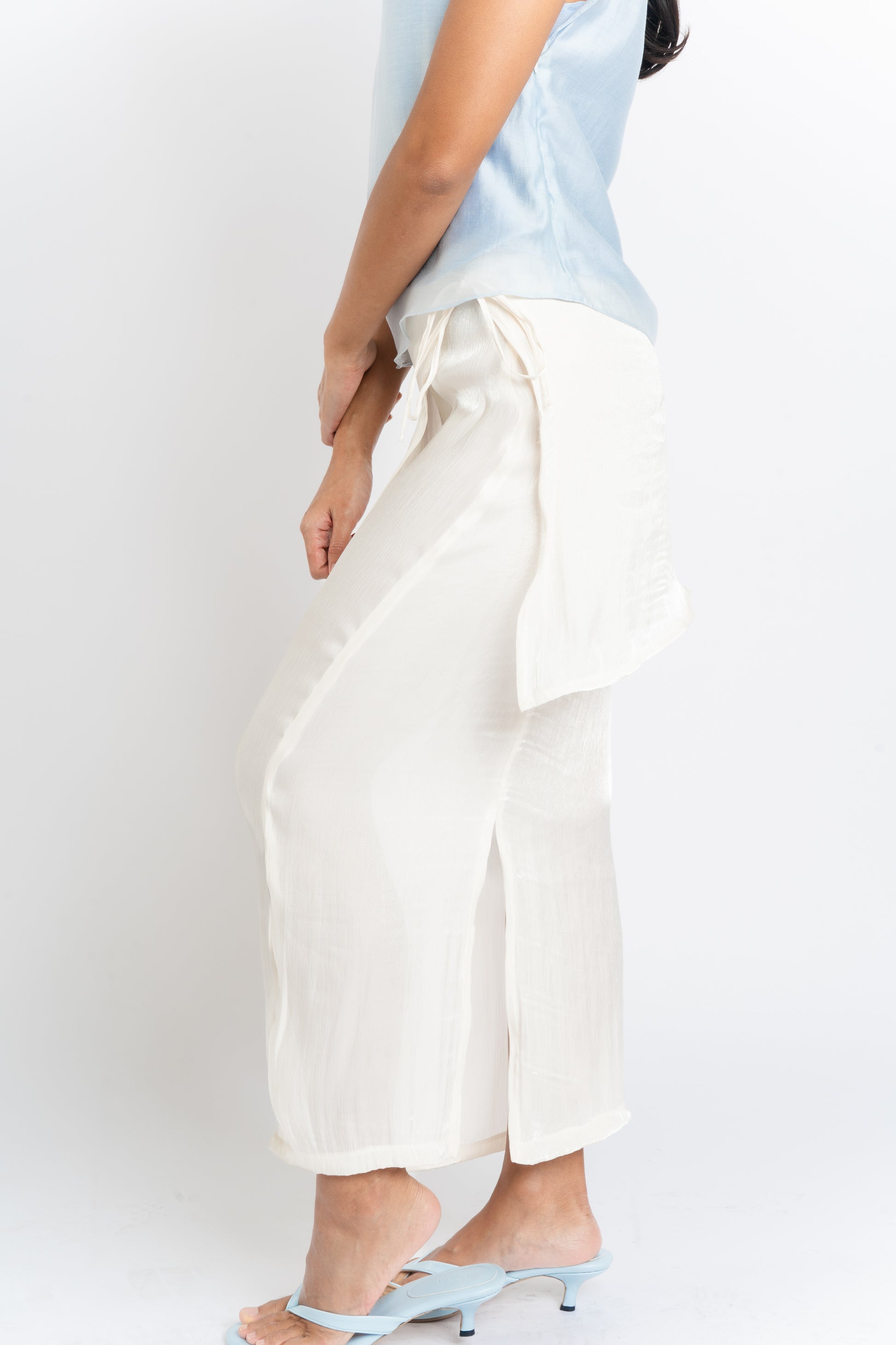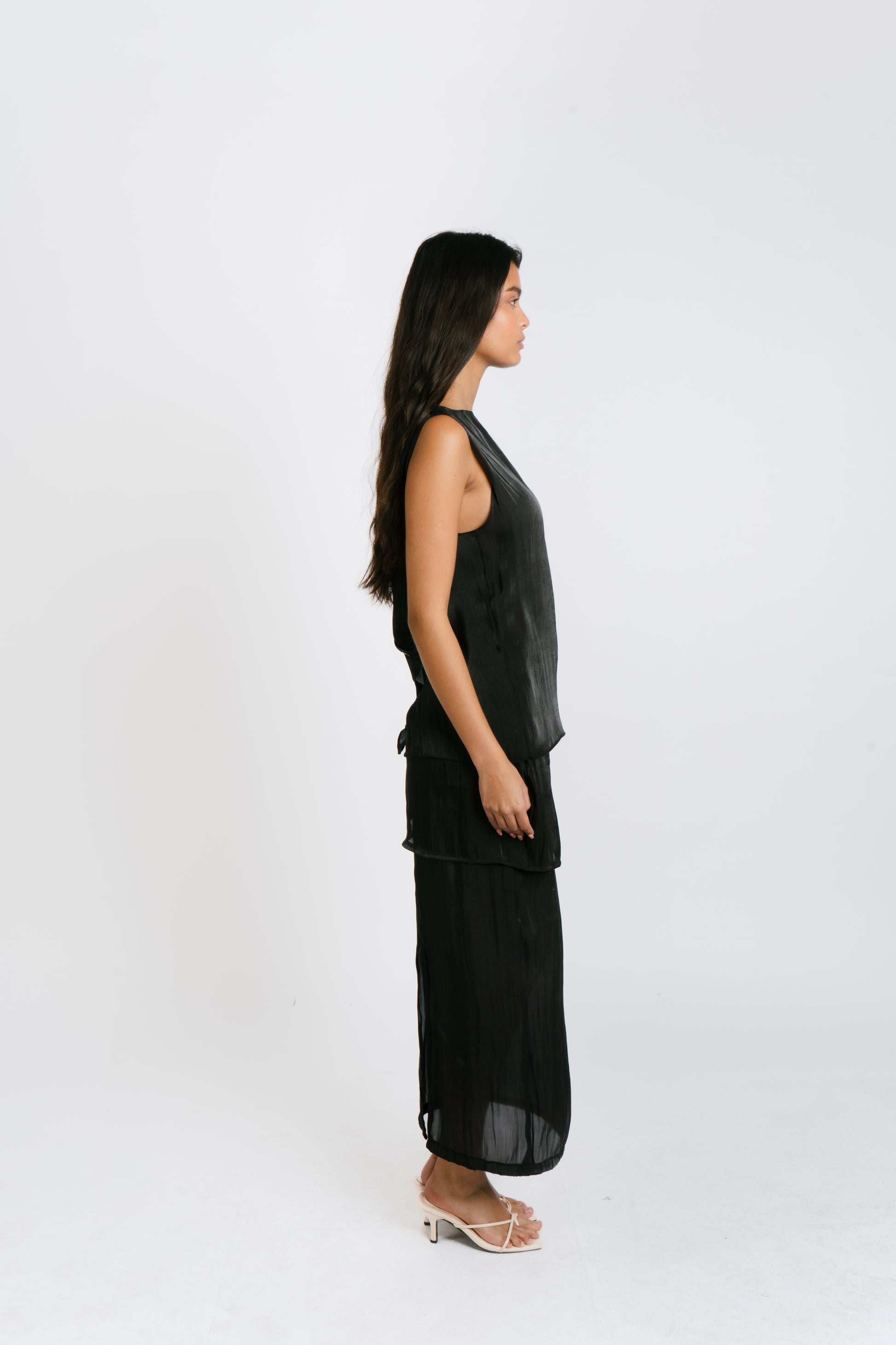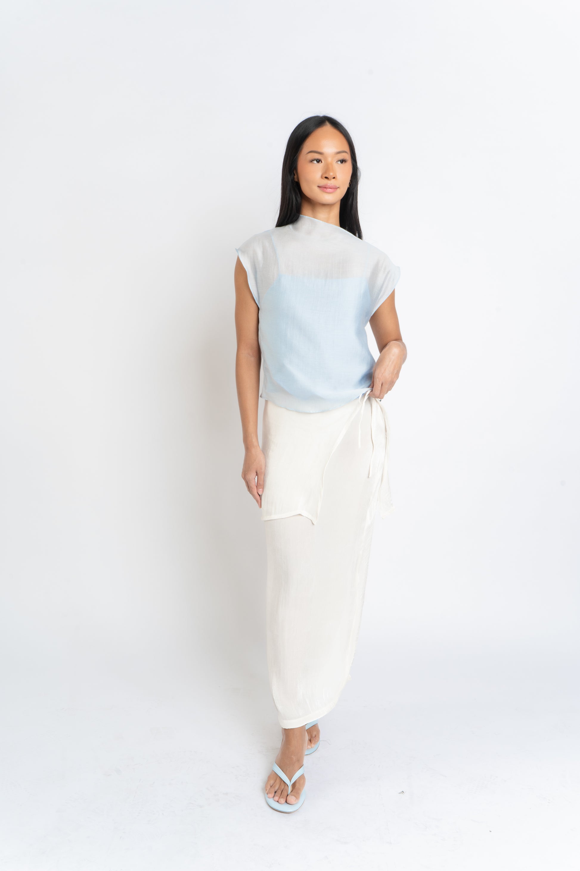 The Mara Skirt features a straight cut skirt with back slit and a removable second layer that can be worn as a separate accessory. It has a back zipper and button to keep the second layer in place. Made in Lyocell. Model wears XS.