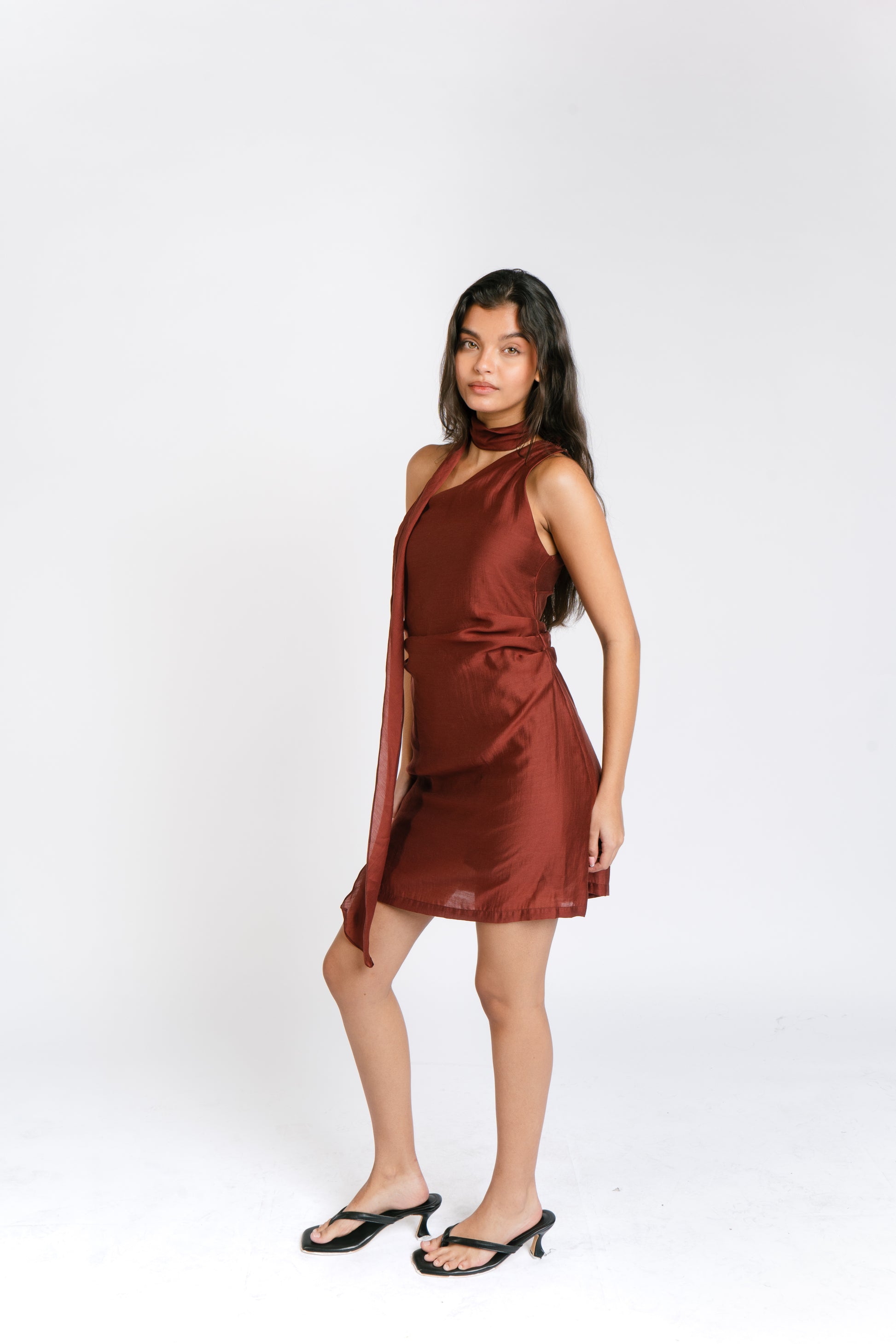 The Milan Dress features an asymmetrical neckline with waist pleats for a cinched look. It sports a removable scarf which can be worn multiple ways and attached to the dress by buttons. Made in Chiffon. Fabric is semi sheer but top is fully lined. Model wears XS.