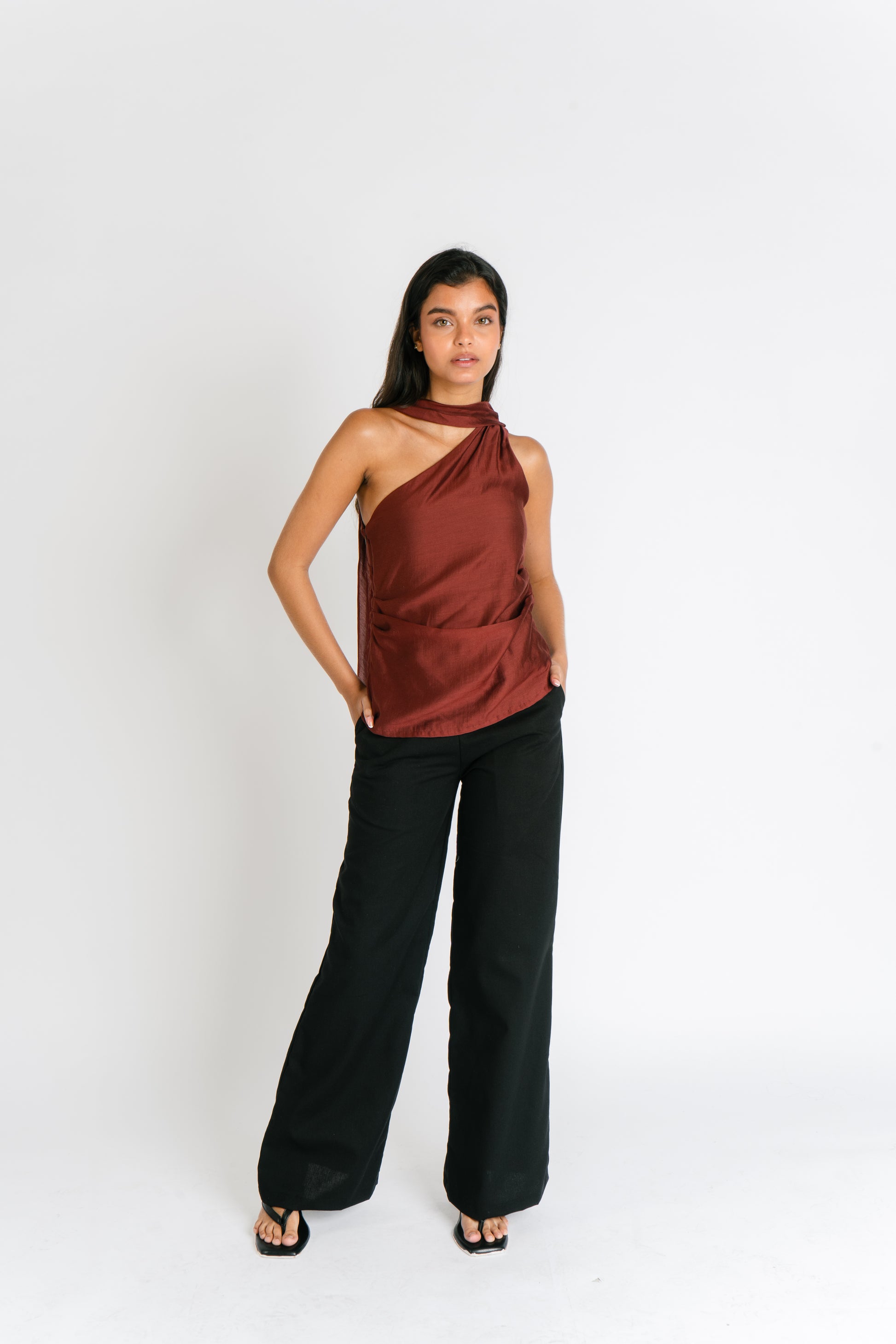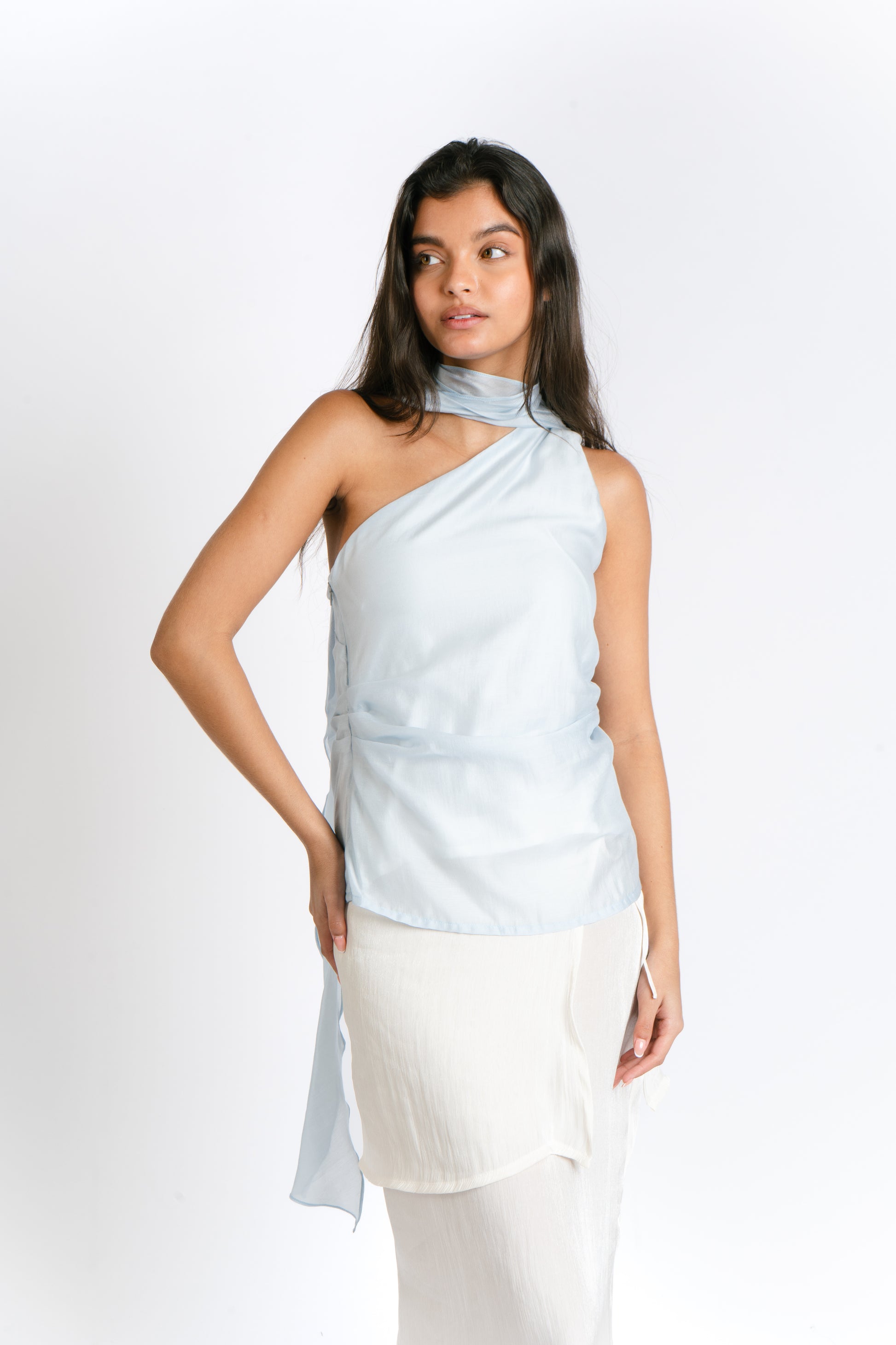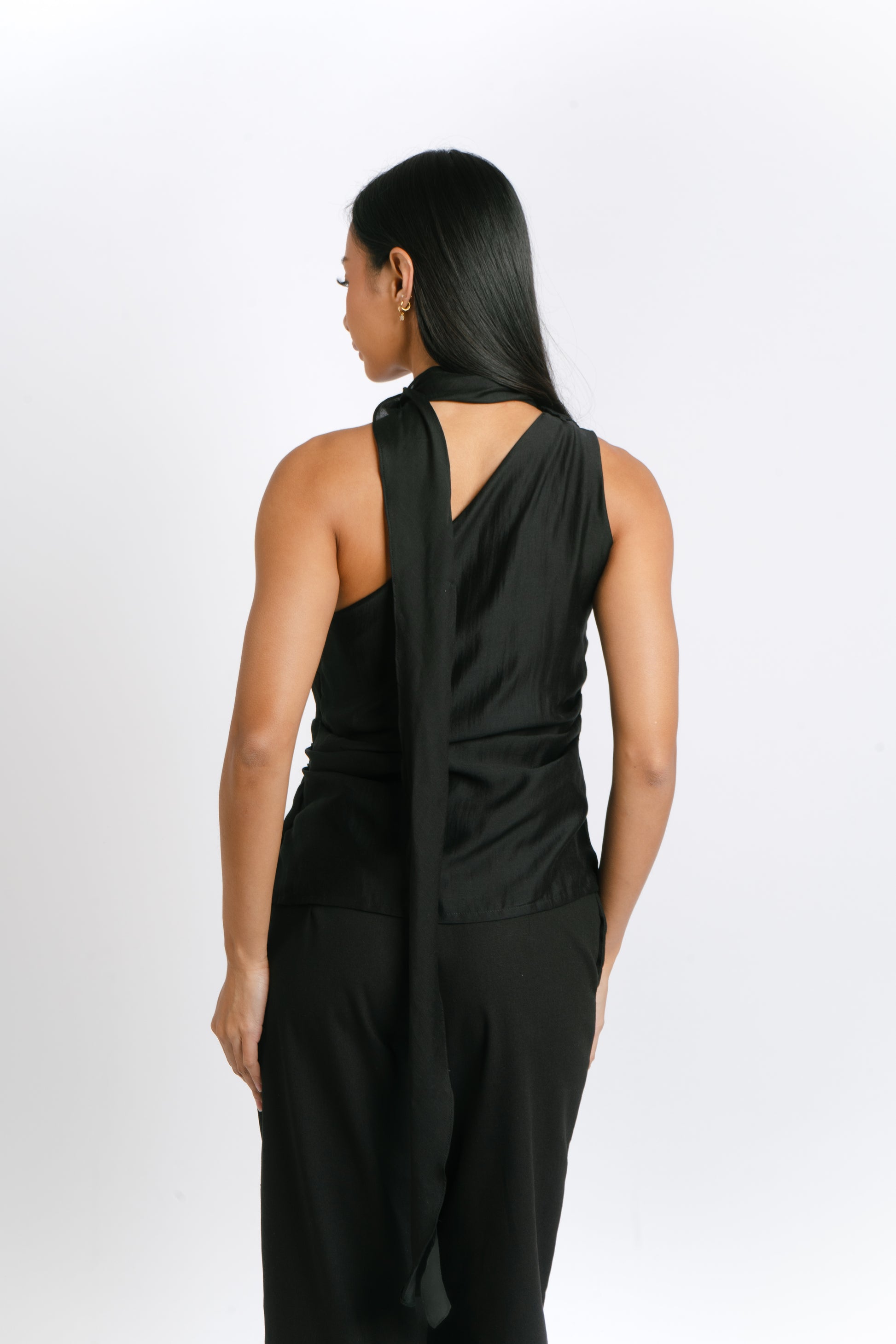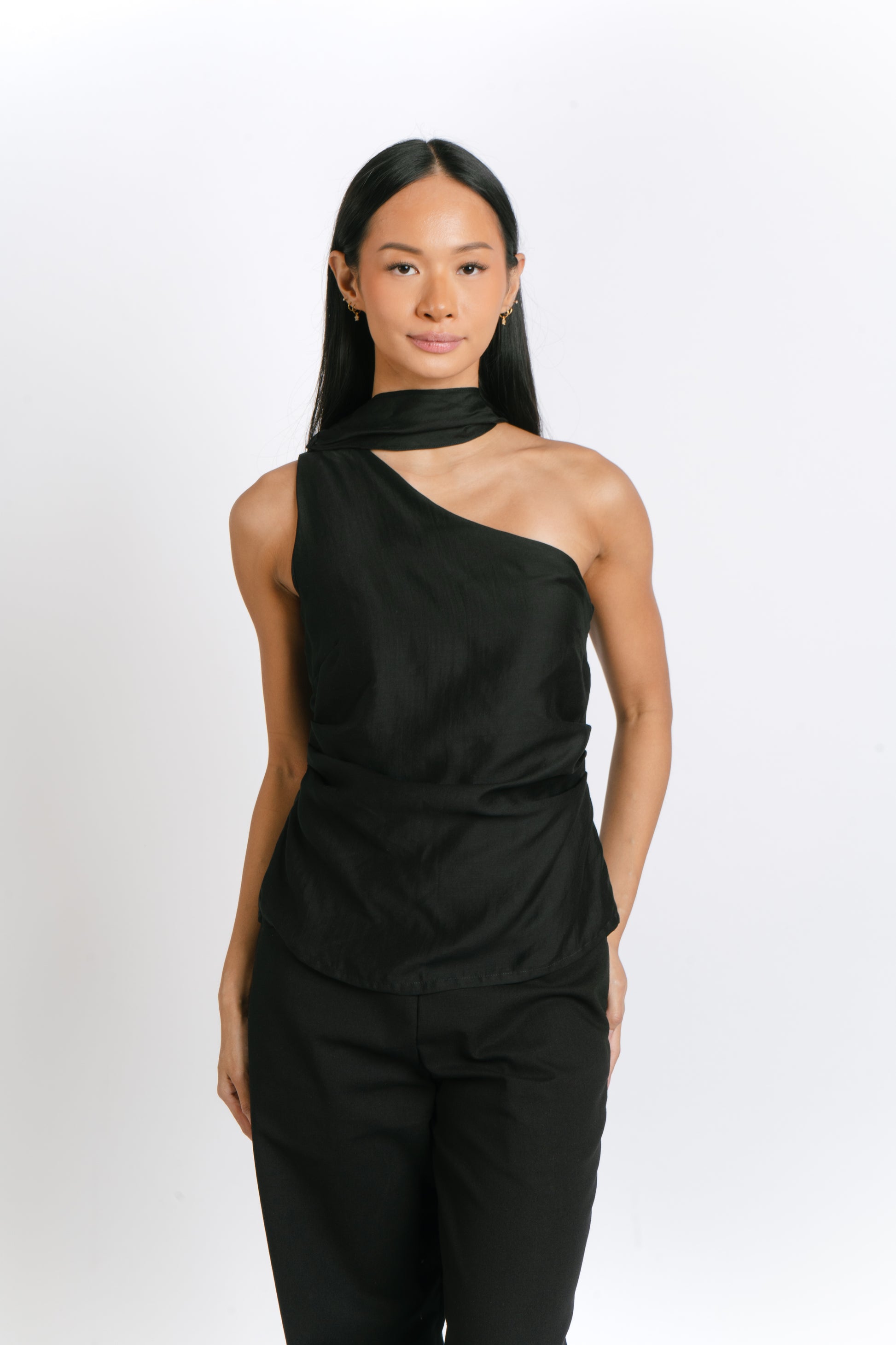 The Milan Top features an asymmetrical neckline with waist pleats for a cinched look. It sports a removable scarf which can be worn multiple ways and attached to the top by buttons. Made in Chiffon. Fabric is semi sheer but top is fully lined. Model wears XS.