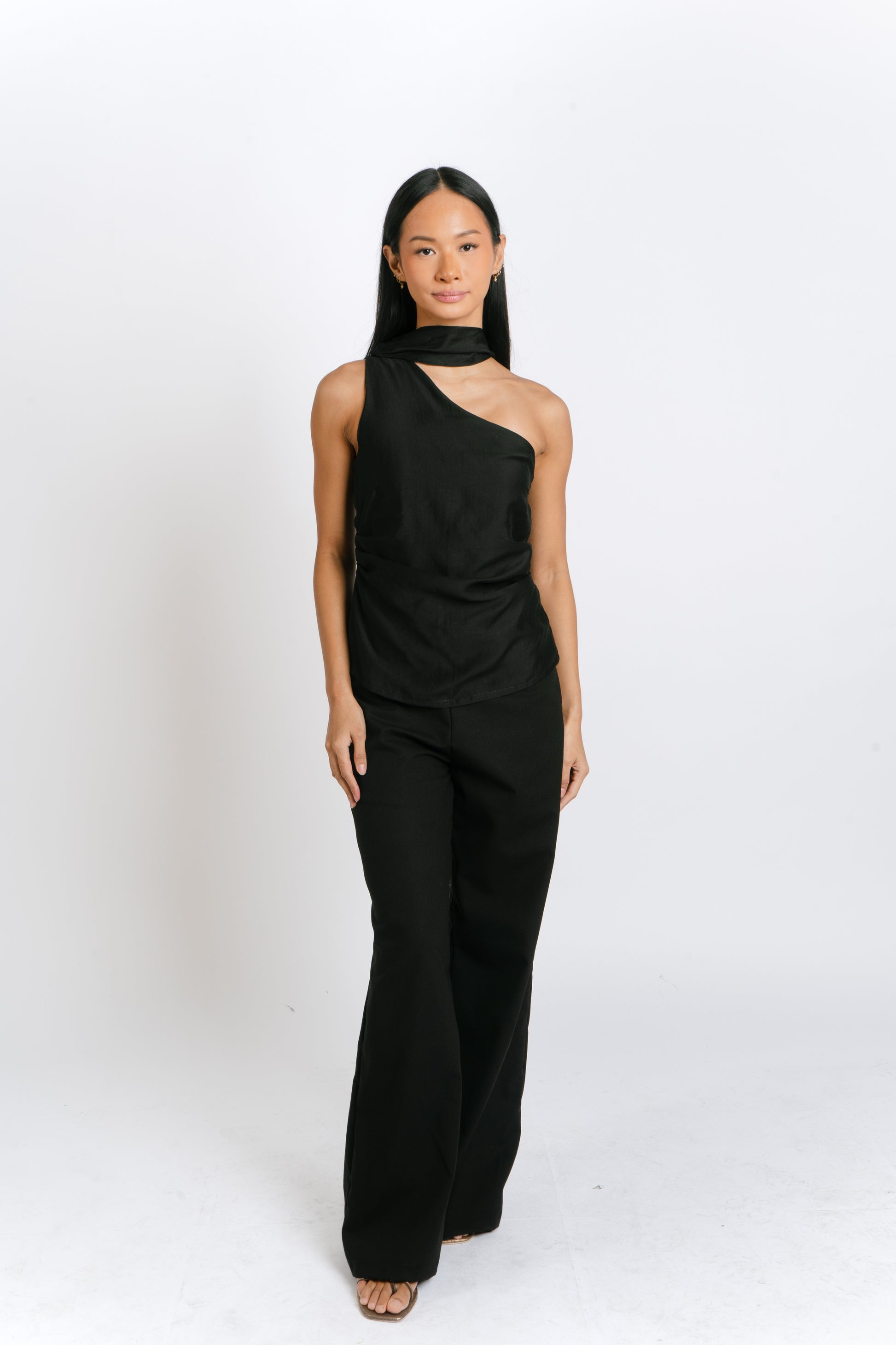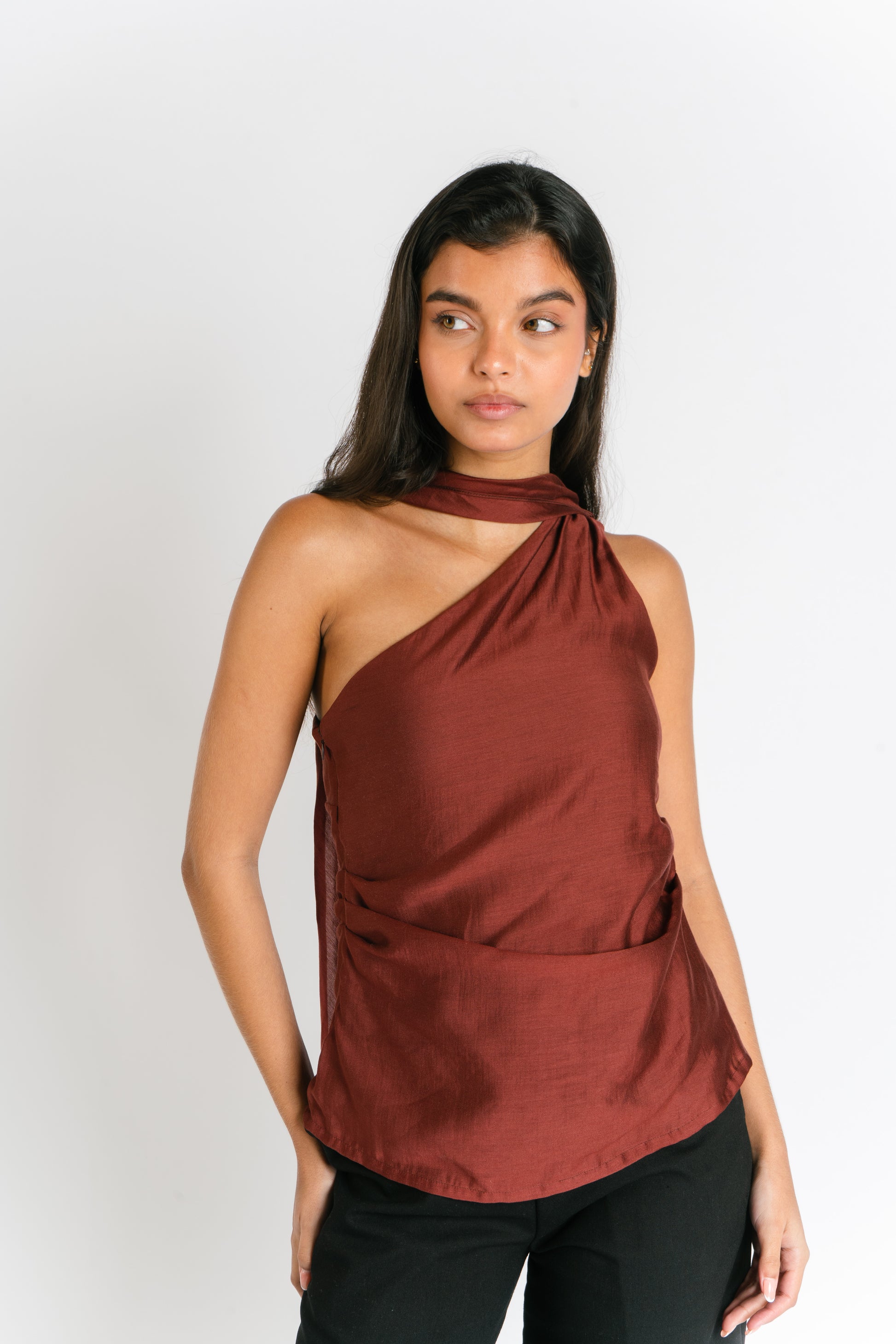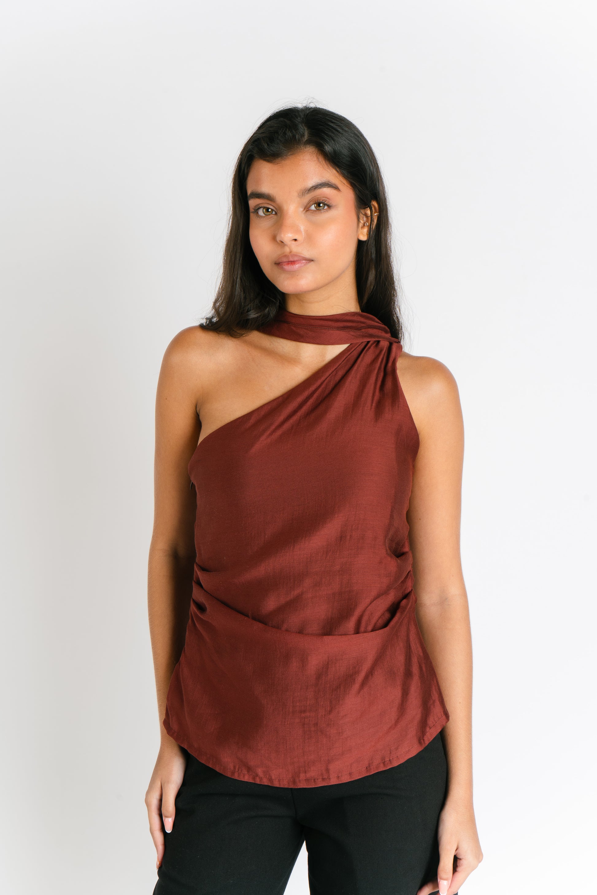 The Milan Top features an asymmetrical neckline with waist pleats for a cinched look. It sports a removable scarf which can be worn multiple ways and attached to the top by buttons. Made in Chiffon. Fabric is semi sheer but top is fully lined. Model wears XS.