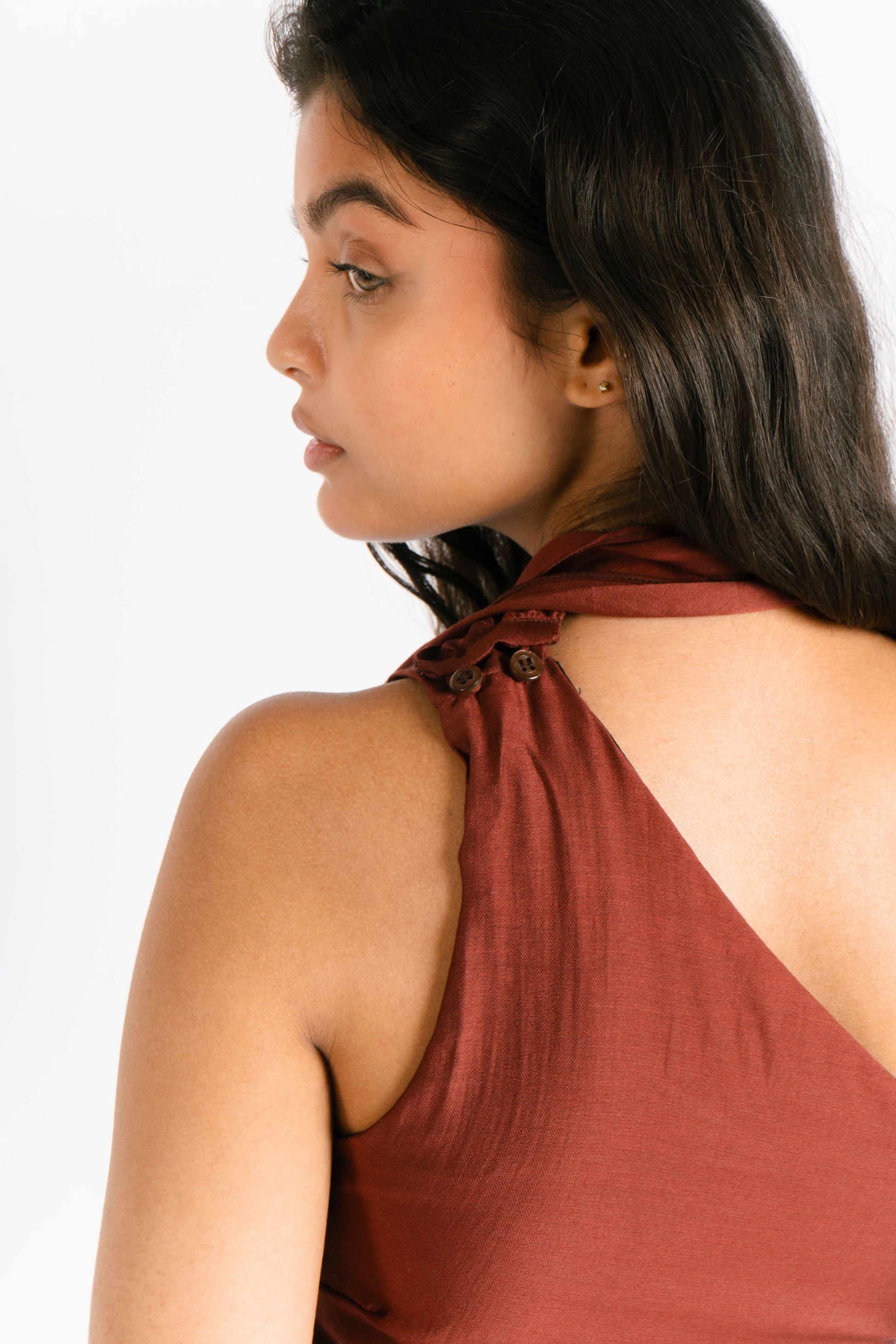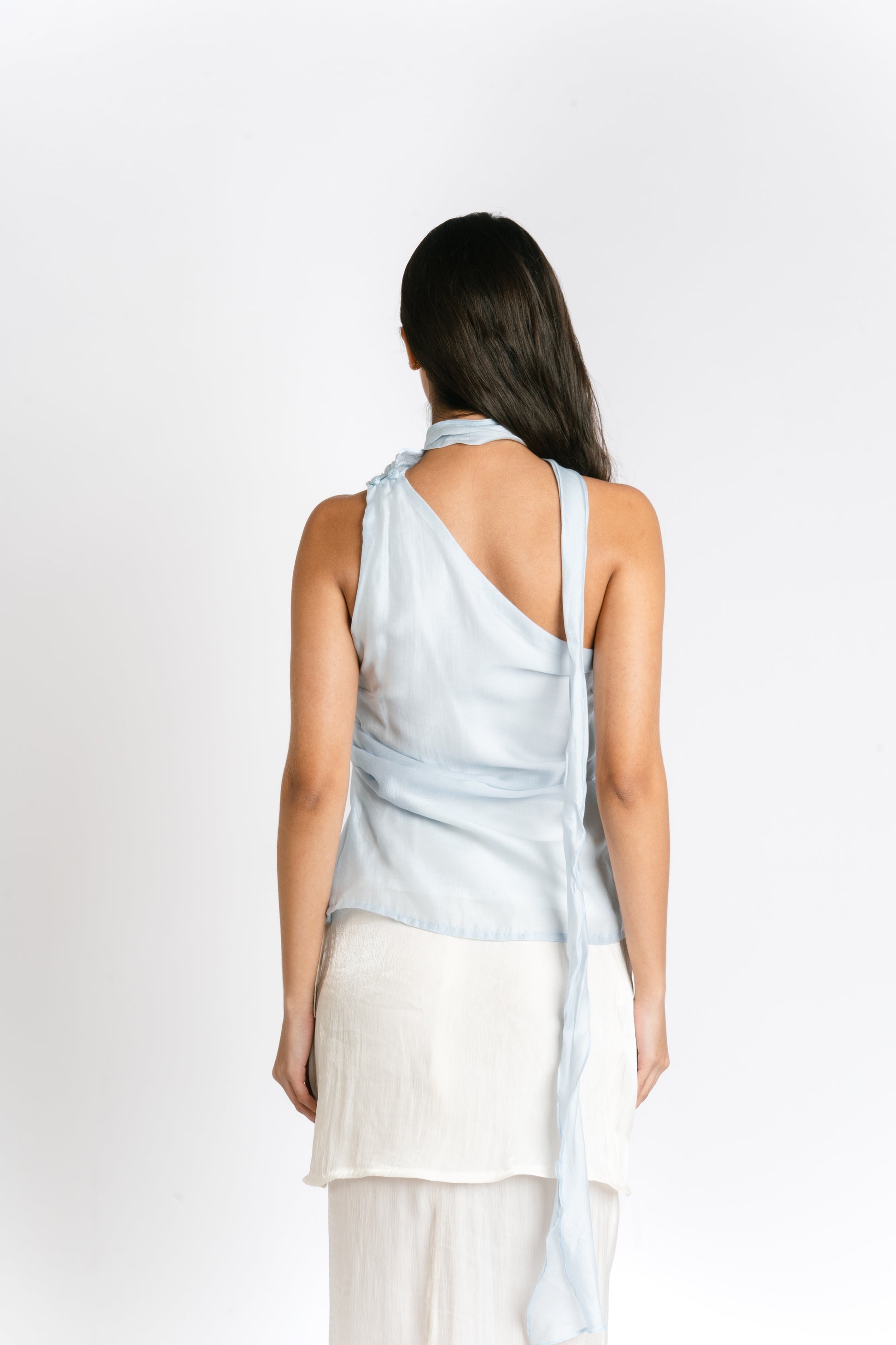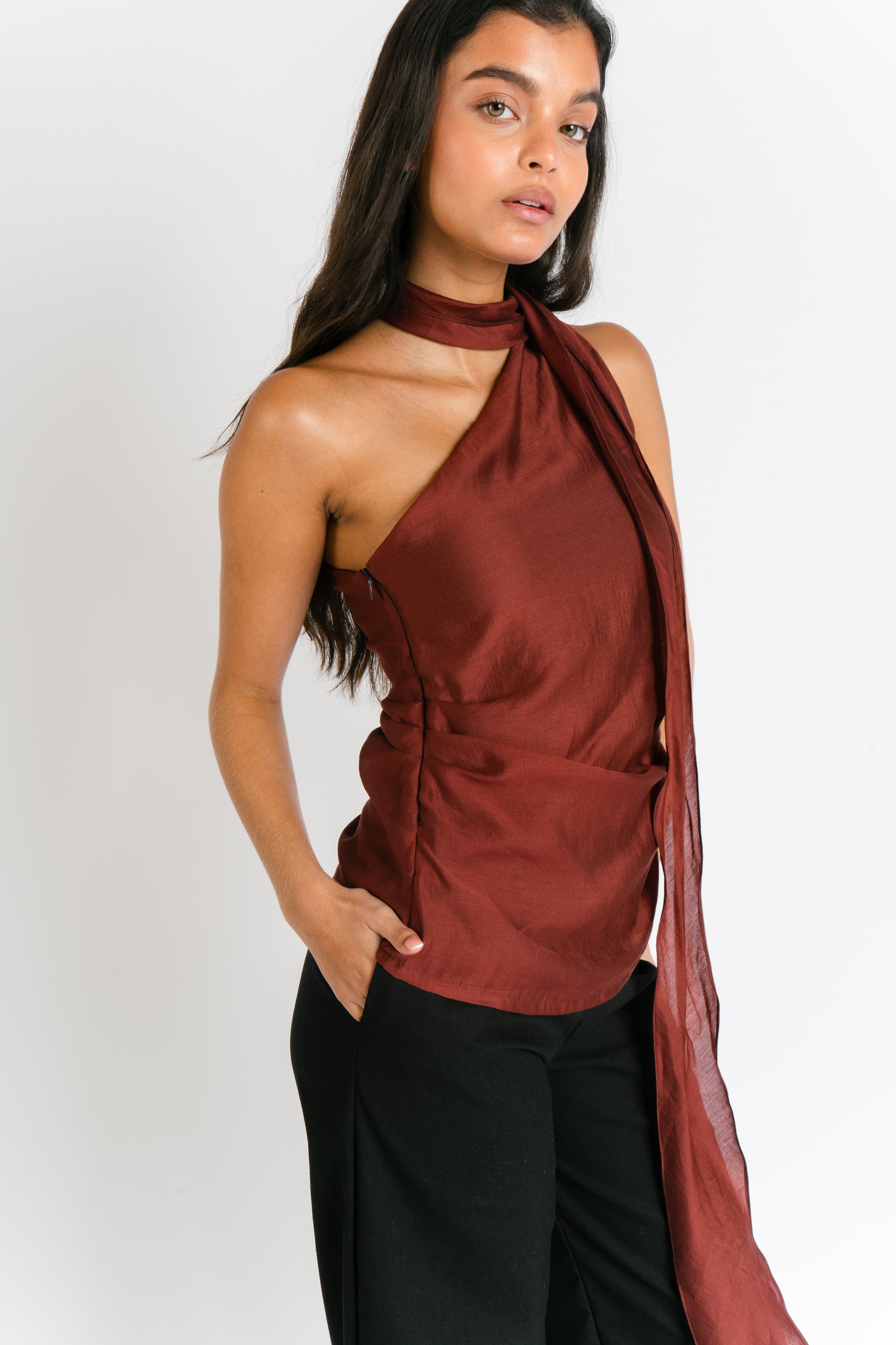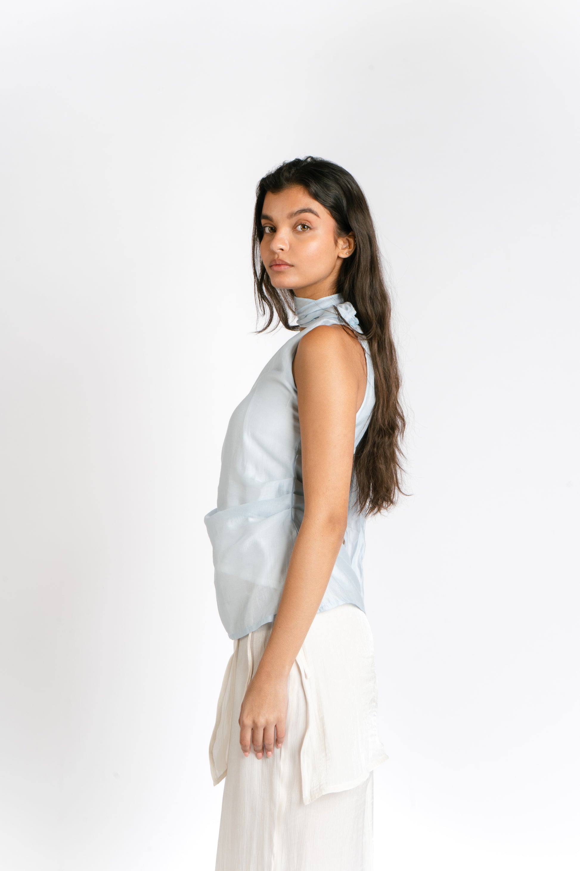 The Milan Top features an asymmetrical neckline with waist pleats for a cinched look. It sports a removable scarf which can be worn multiple ways and attached to the top by buttons. Made in Chiffon. Fabric is semi sheer but top is fully lined. Model wears XS.