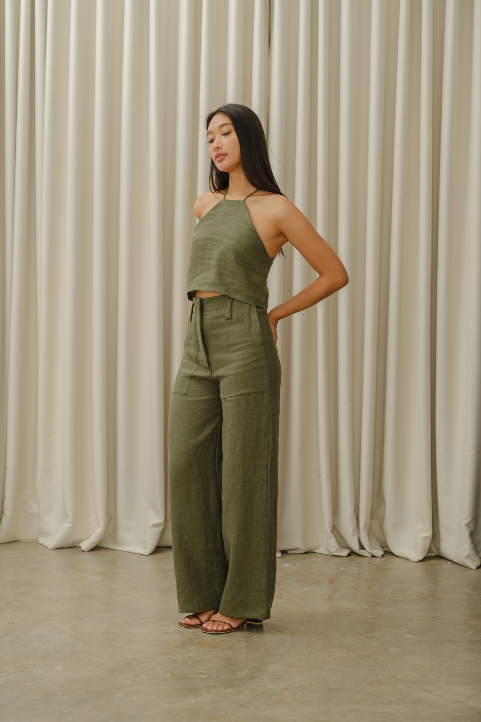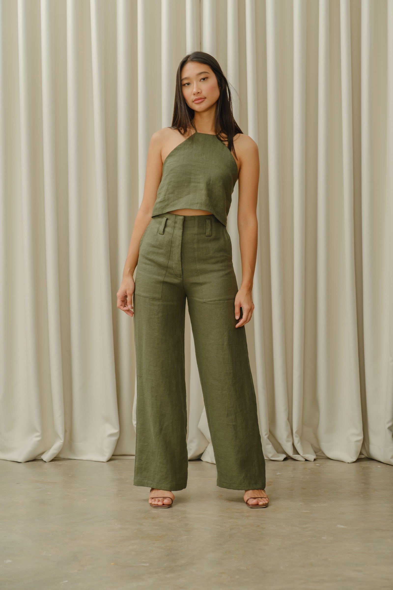 Everyday straight cut pants with a flat front and side slit pockets. Features an invisible hook closure and 5 belt loops. Models wear Extra Small. Made in Linen.