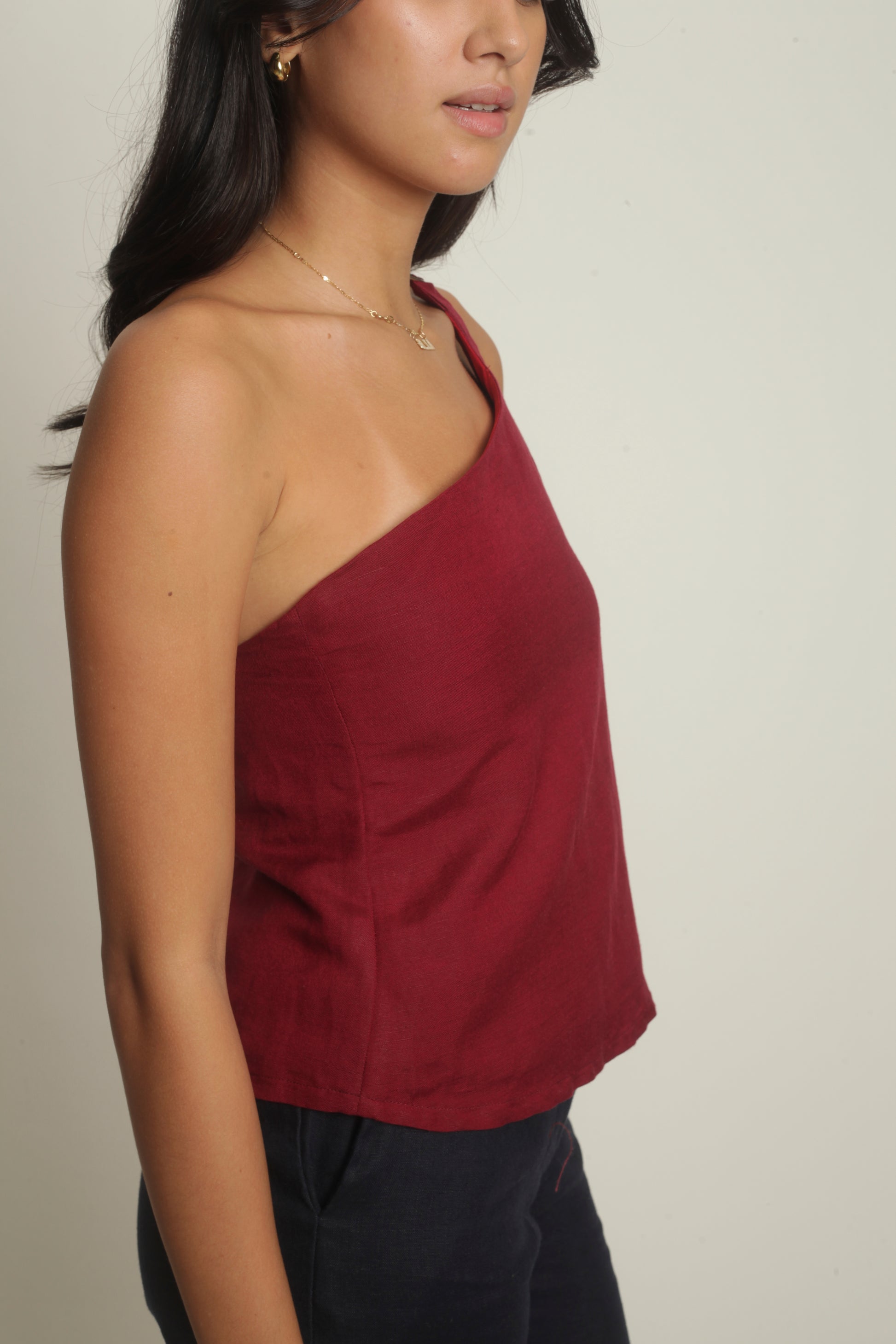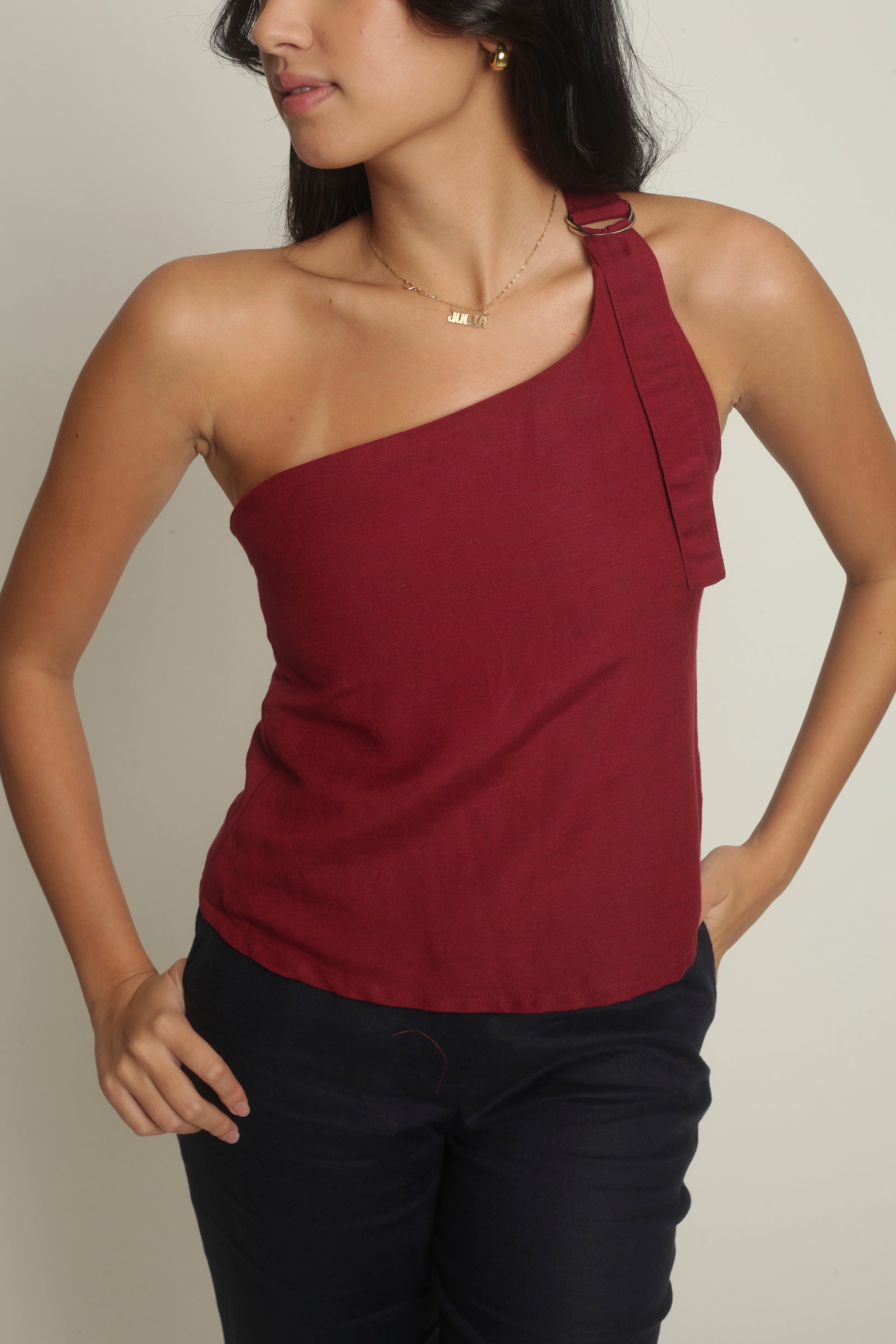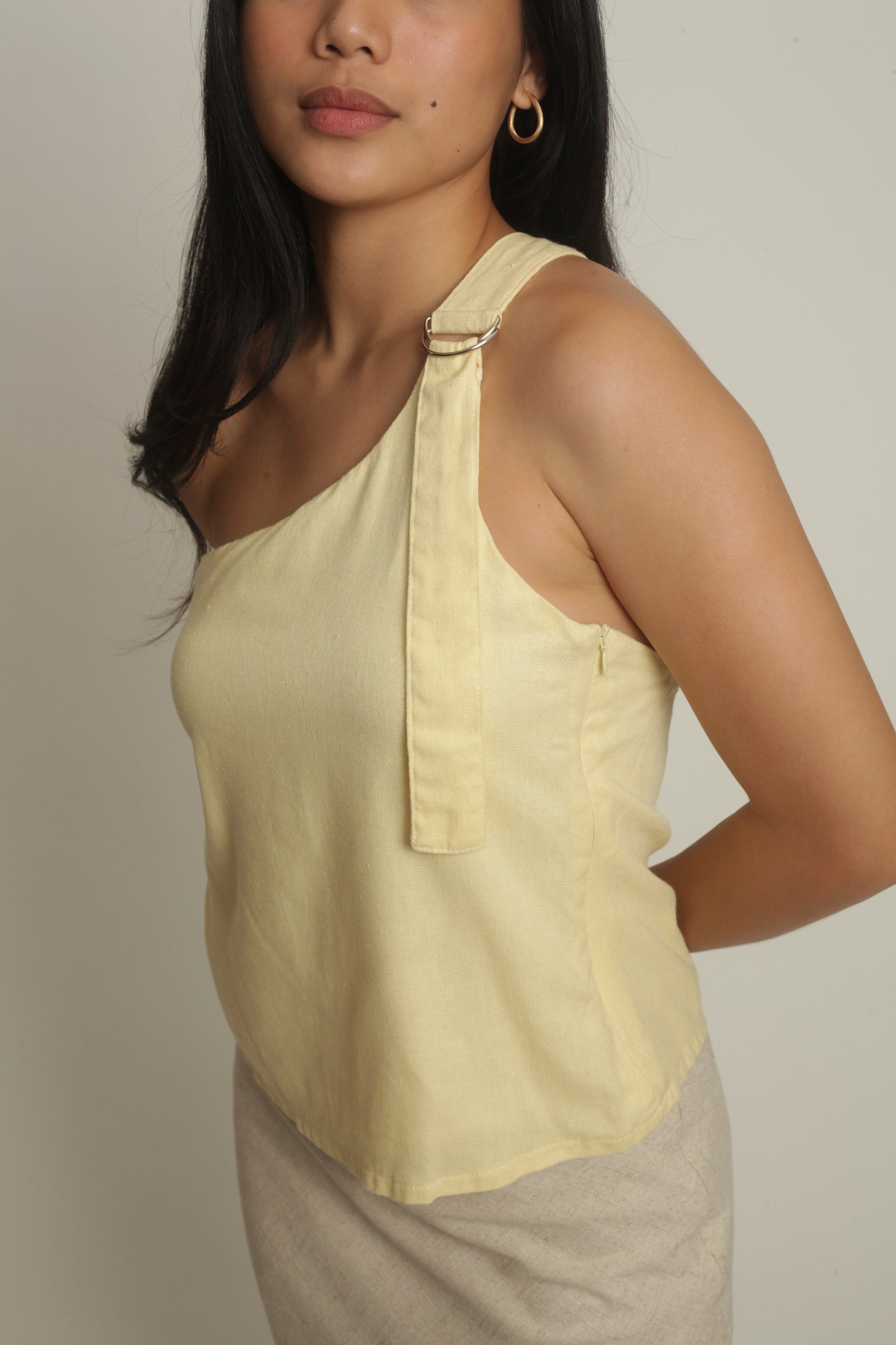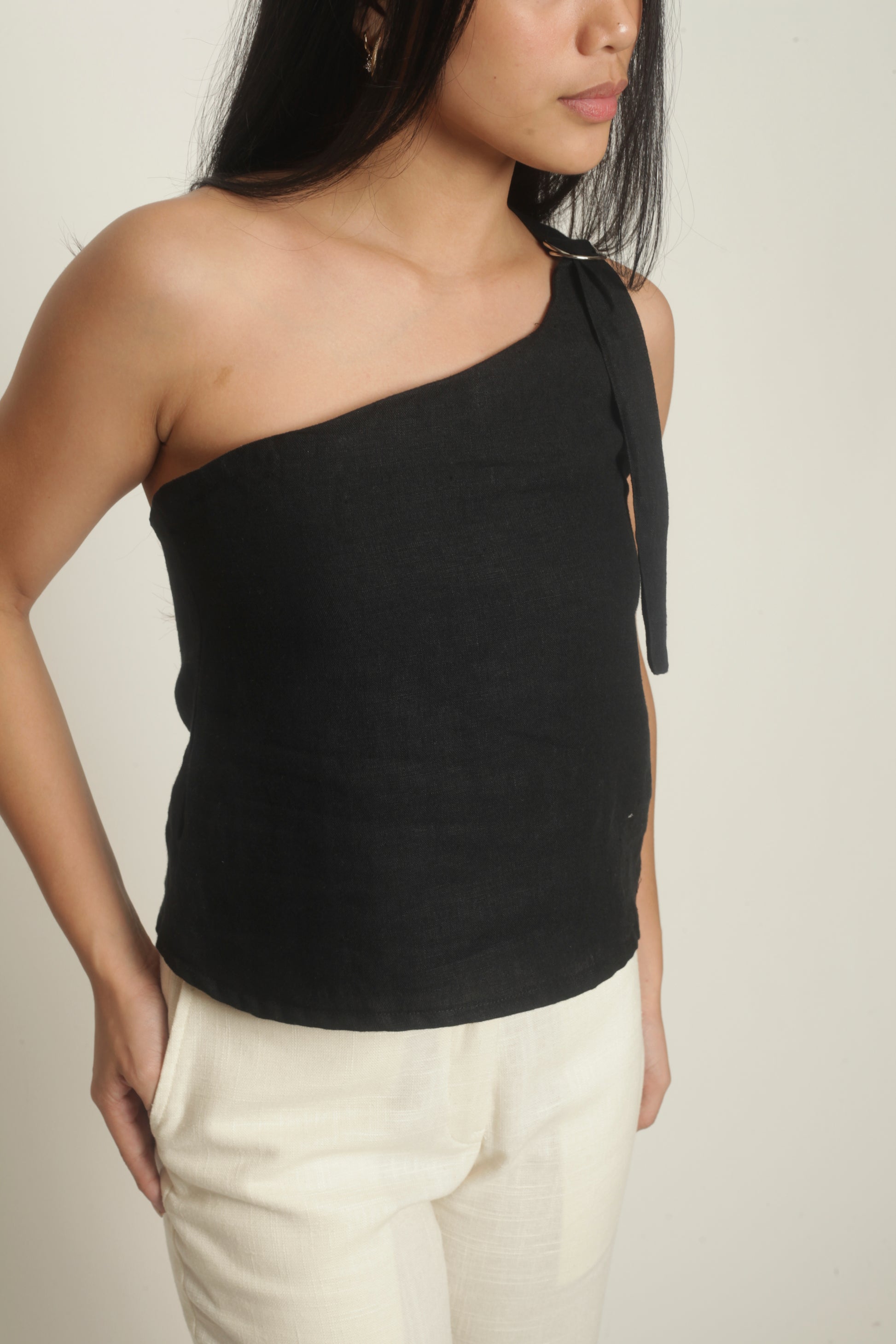 The Simone Top sports an asymmetrical neckline with a front buckle detail. It features a side zipper and is fully lined. Best paired with the Anya Pants or Maita Pants. Made in Linen. Model wears XS.