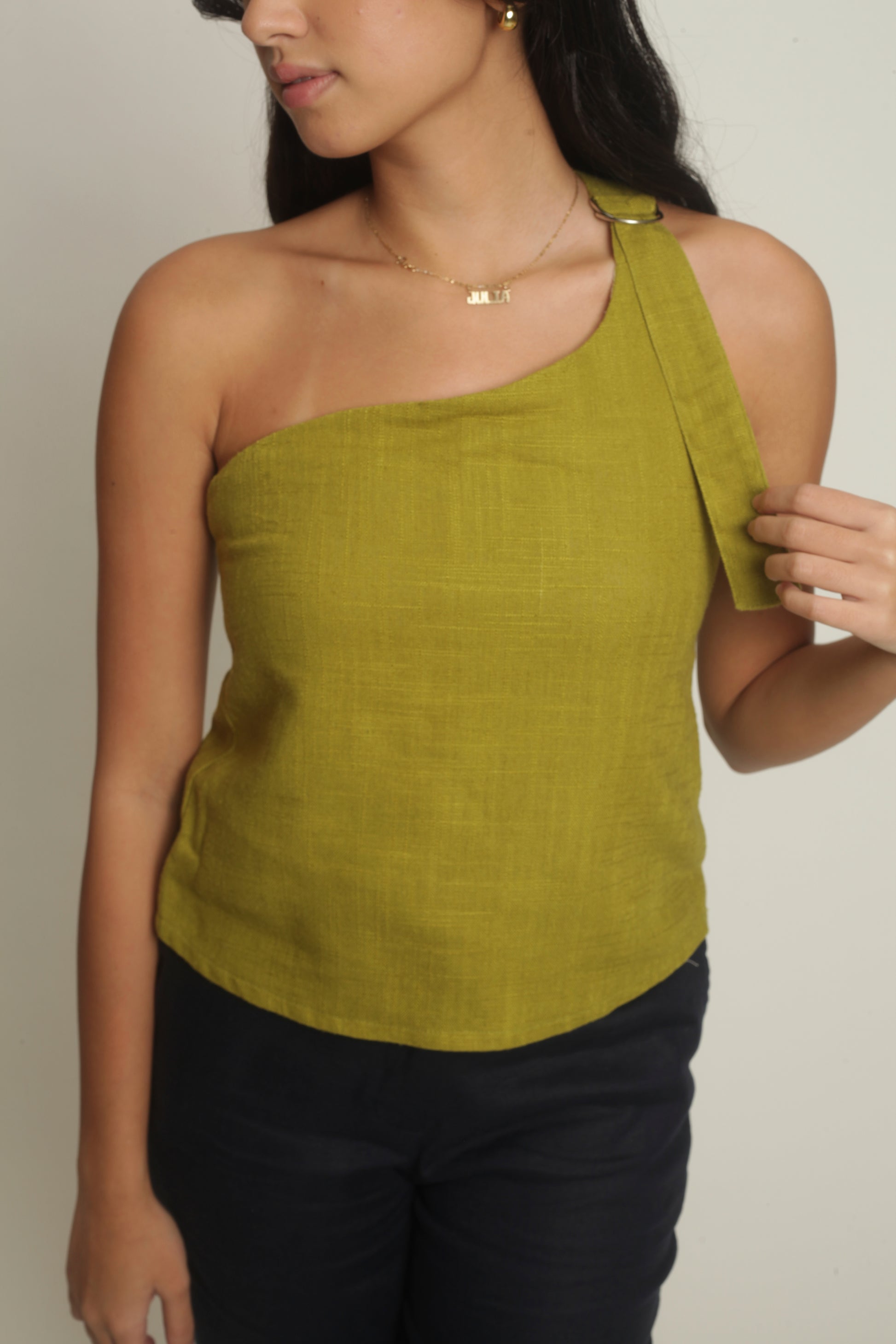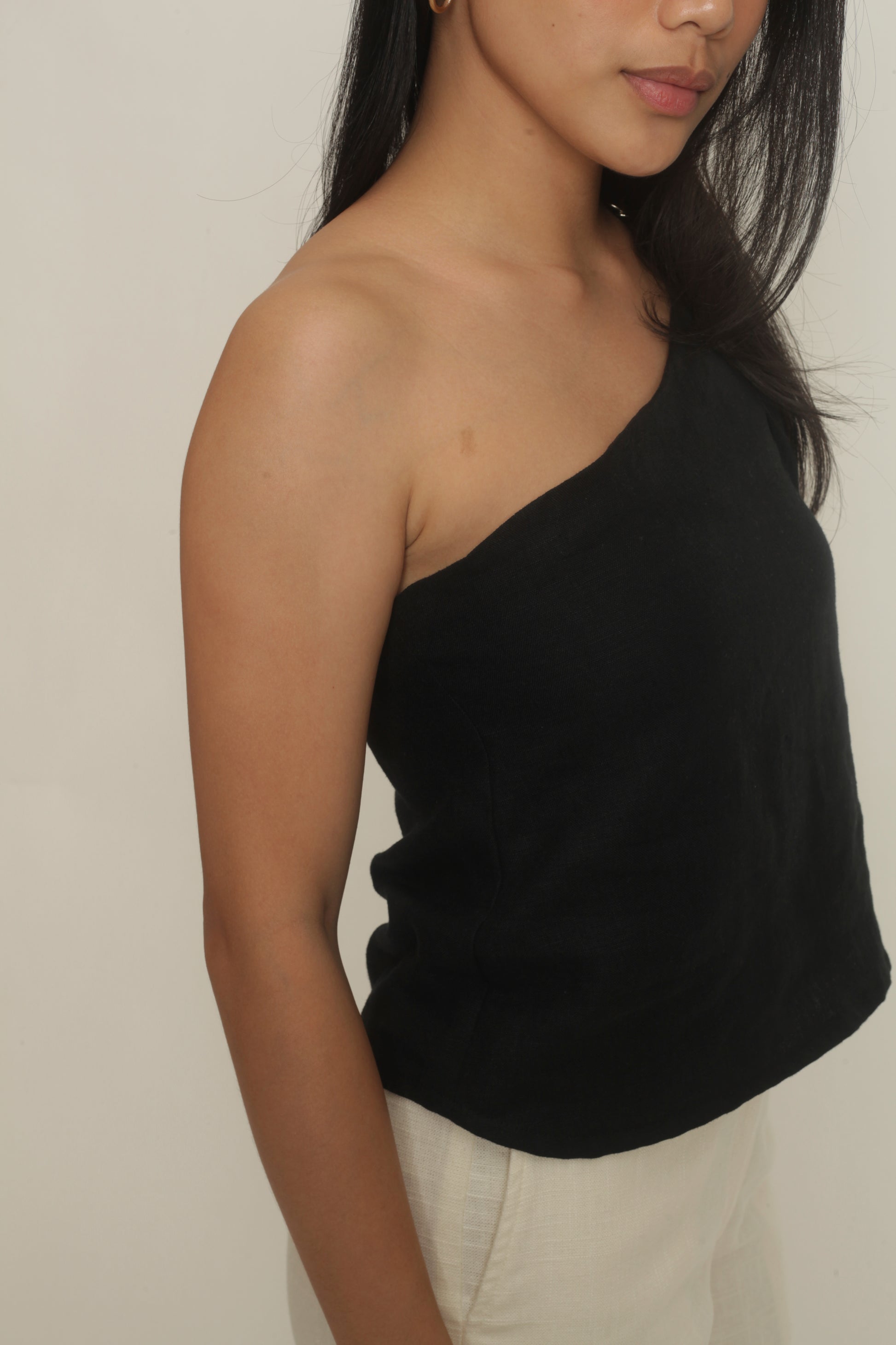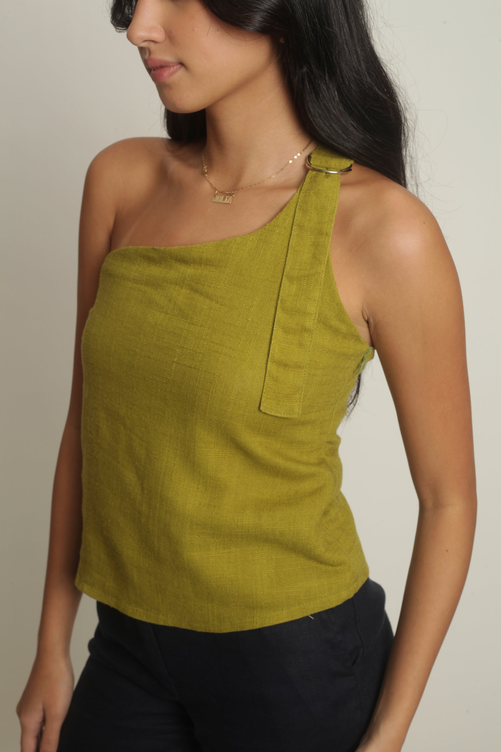 The Simone Top sports an asymmetrical neckline with a front buckle detail. It features a side zipper and is fully lined. Best paired with the Anya Pants or Maita Pants. Made in Linen. Model wears XS.